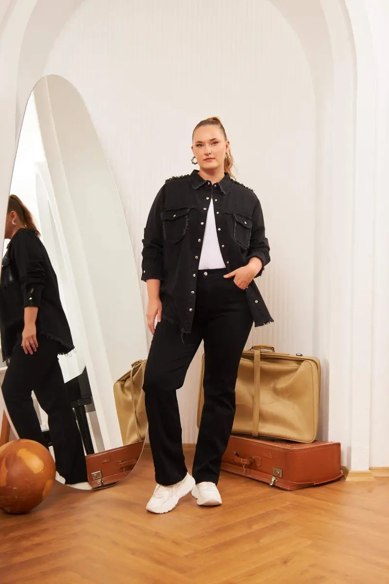 Boru Paça Büyük Beden Siyah Kot Pantolon