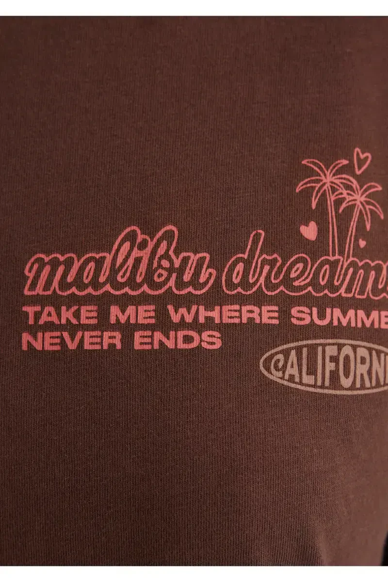 Jigarrang bosma, nol yoqali, qisqa yengli, keng bichimli futbolka. 100% paxta.