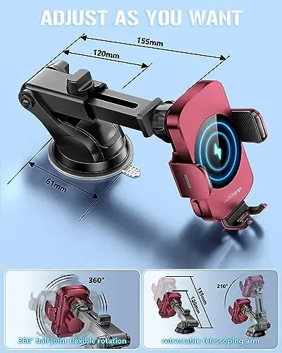 [15W QI Fast Wireless Car Charger]: The Solution for Charging Your Qi-Enabled Smartphone on the Go. Experience Optimized Power Output Transfer With CHARGING Speed for LG V50/V40/V30++ , 10W Fast Charger fit for Samsung Galaxy S22 Ultra/S21+/S20/Note 10+, 7.5W For iPhone 17 16 15 14 13 /12 Pro Max/11/XS Max/XS, and 5W for other Qi-enabled phones. fast charging modes (15W/10W/7.5W), a QC 3.0 car charger adapter (not included) is required for power supply [Enhanced suction cup up to 50LB]: Car Phone Mount with Wireless Charging –With upgraded super-strong suction and a super-sticky gel pad, it firmly attaches to the dashboard, windshield, and other flat surfaces. Retains strong suction even at high temperatures. Maintenance is a breeze – rinse with warm water and air dry to restore the suction cups. Upgrade your driving experience with this car must haves reliable and versatile car phone mount [Flexible Angle Adjustment]: The cell phone holder car features a 360° ball joint and a retractable telescoping arm, allowing you to customize your phone to any angle without obstructing your view. The adjustable angles enable both portrait and landscape modes, letting you set the distance and angle between the car mount and your device. Ensure safe driving while using GPS and other features, and enjoy a hassle-free driving experience [3-in-1 Car Phone Holder]: The phone holder car is equipped with suction cups and ventilation clips, which can be freely installed on the windshield, dashboard and air vents to meet your different use needs. The cell phone mount is suitable for most cars, pickup trucks, SUVs, taxis. The assistant for Uber, Lyft drivers. Make it easier to charge your phone in the car [Convenience and Ease of Use]: No more messy cables and fumbling plugs while driving, cell phone car mount for car making it a must-have accessory for any man or woman's car with some quality of life features