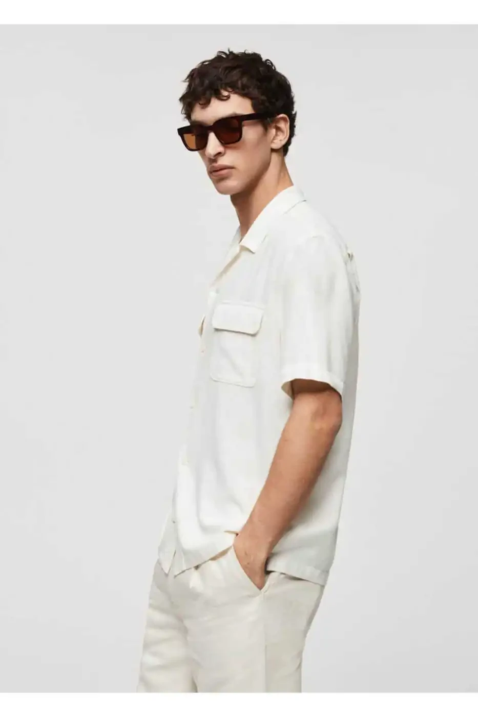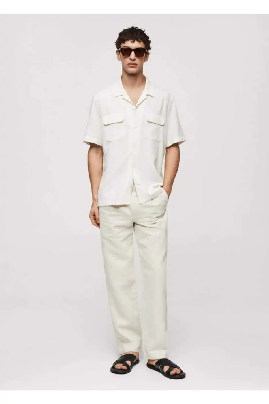 **Bowling Collar and Pocket Linen Shirt**This product will be shipped by Trendyol and is on sale at a discounted price. Due to limited stock, you can order a maximum of 5 units. Products offered by different sellers are ranked based on factors such as price, seller rating, delivery time, promotions, free shipping availability, express delivery option, stock status, and category. The maximum order quantity is 10 units. This limit does not apply to corporate orders, and different limits may be set for such orders. You can return the product free of charge within 15 days of receipt. For more information, please [**click here**](return_conditions).**Shirt Features:*** Regular fit* Cotton blend fabric* Patterned fabric* Bowling collar* Front button closure* Short sleeves* Two patch pockets on the front* Straight hem* The model is 185 cm tall and is wearing a size M.* Material: 52% linen, 48% viscose* Side seam length: 44.0 cm* Back length: 75.0 cm**Care Instructions:*** Hand wash at a maximum temperature of 30°C.* Do not bleach.* Iron at a maximum temperature of 110°C.* Dry clean with perchlorethylene.* Do not tumble dry.