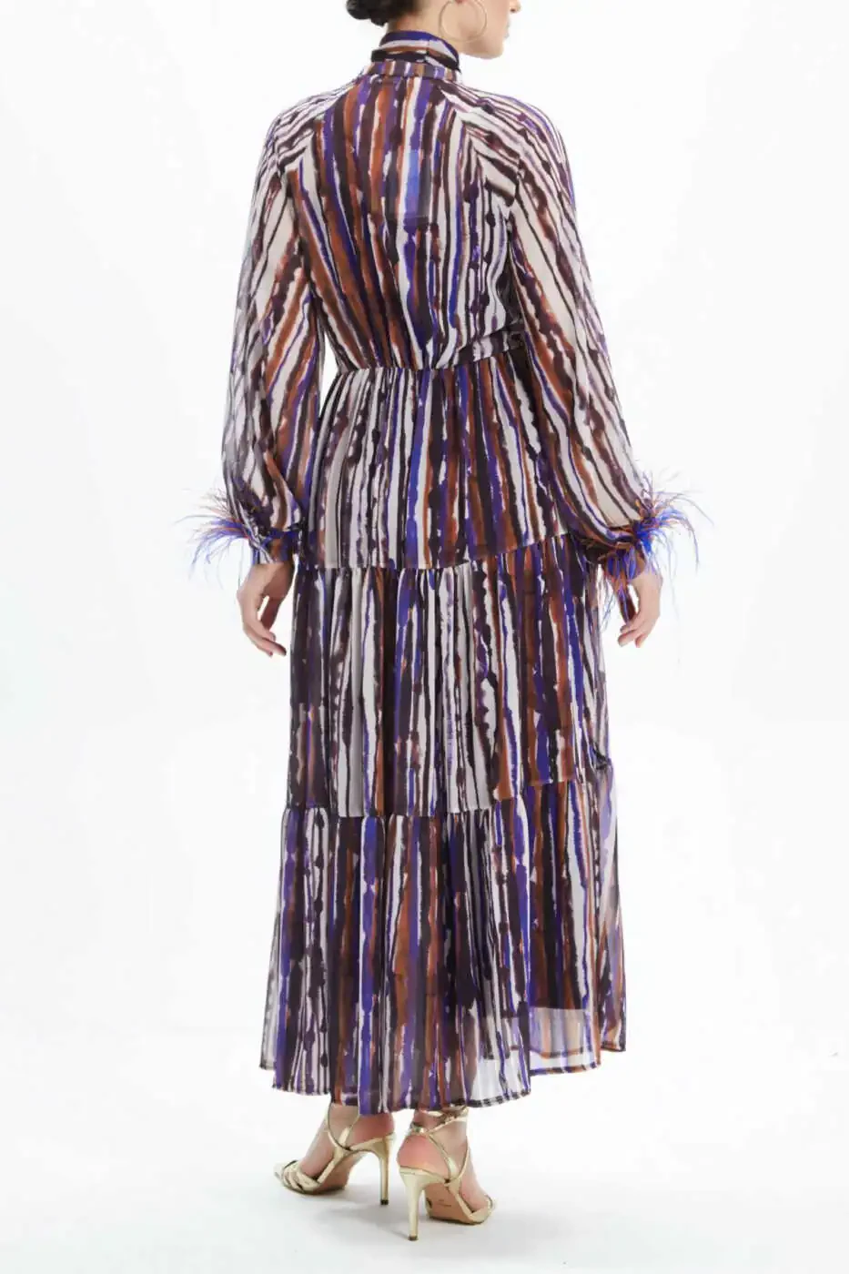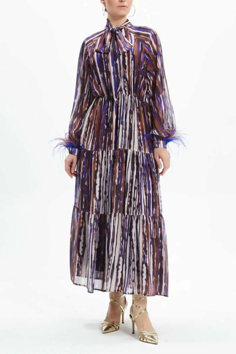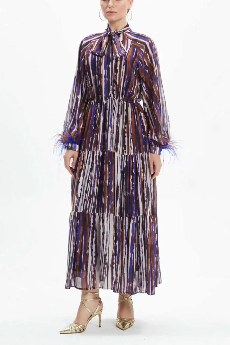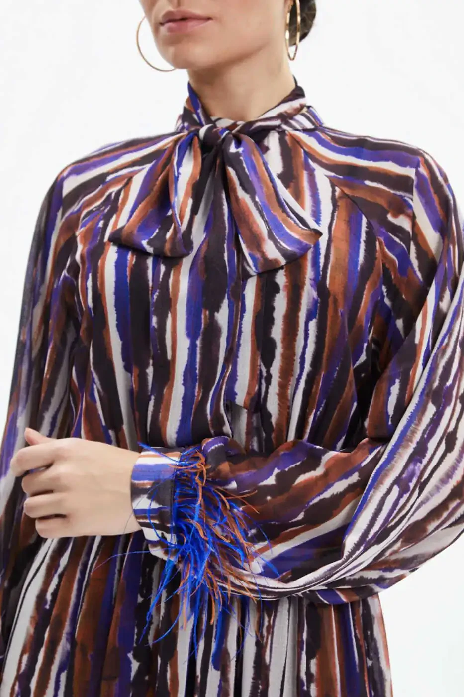 Платье длины миди с завязкой на шее и оторочкой отриш на манжетах рукавов 39098