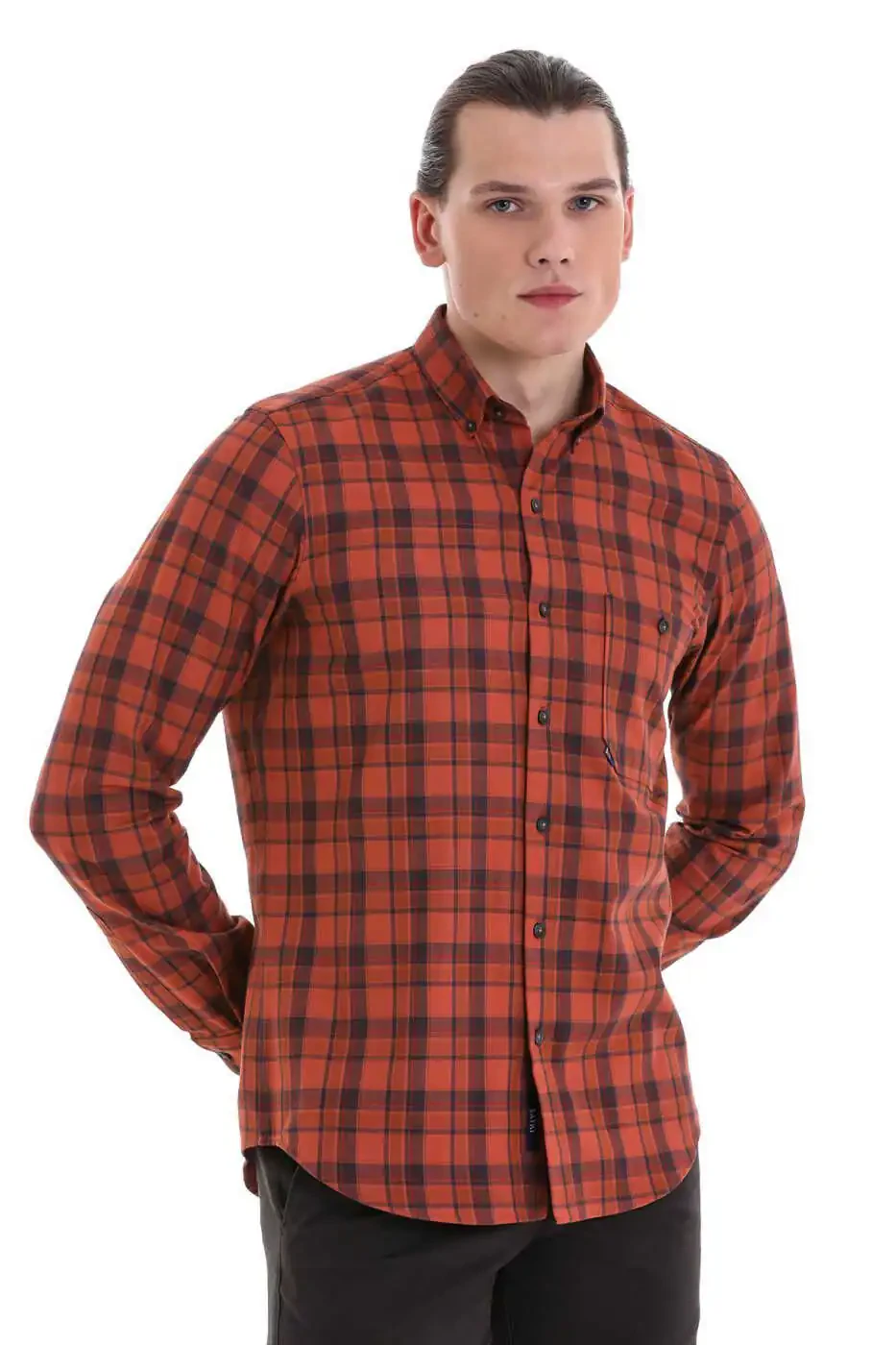 shirt, cotton, checkered, comfort fit, long sleeve, button-down collar, brick red, comfortable, stylish, casual