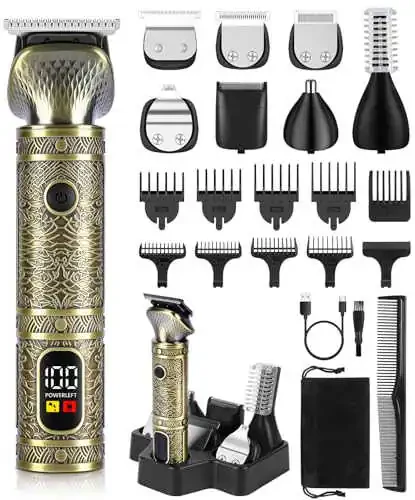All in One Mens Trimmer: It has 7 trimmer heads, a T blade edgers, 2 in 1 cutting head to trim hair and beards, a foil shaver, a nose hair trimmer, a body hair trimmer for men, a precision beard trimmer and a design trimmer.