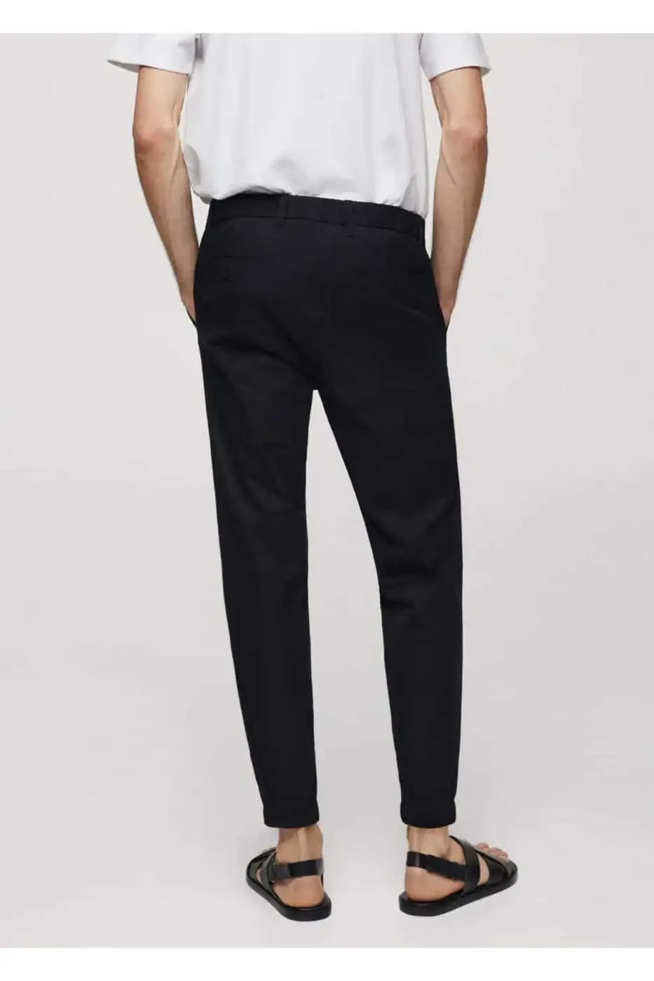 **Брюки из 100% хлопка, зауженного кроя** Эти брюки зауженного кроя из 100% хлопка предназначены для обеспечения комфортного и стильного внешнего вида. Узкий крой, эластичный пояс сзади и эластичные манжеты обеспечивают удобную посадку. Шлевки для ремня, застежка-молния и пуговицы делают их практичными и шикарными. Два передних кармана и два задних прорезных кармана на пуговицах позволяют легко носить свои вещи. **Характеристики продукта:** * **Ткань:** 100% хлопок * **Подкладочный карман:** 100% хлопок * **Длина по внутреннему шву:** 73,8 см * **Длина бокового шва:** 101,0 см * **Машинная стирка при максимальной температуре 30°C** * **Не отбеливать** * **Гладить при максимальной температуре 110°C** * **Не подвергать химической чистке** * **Не сушить в стиральной машине**