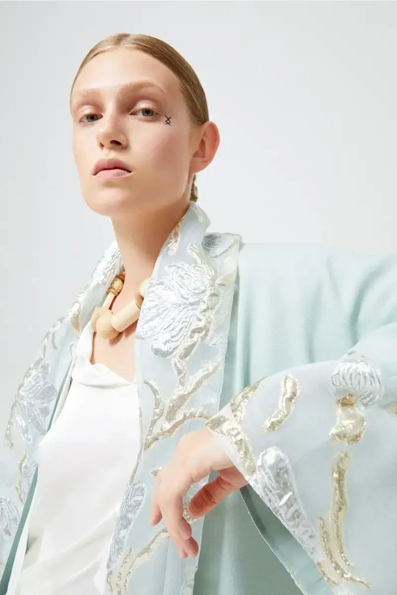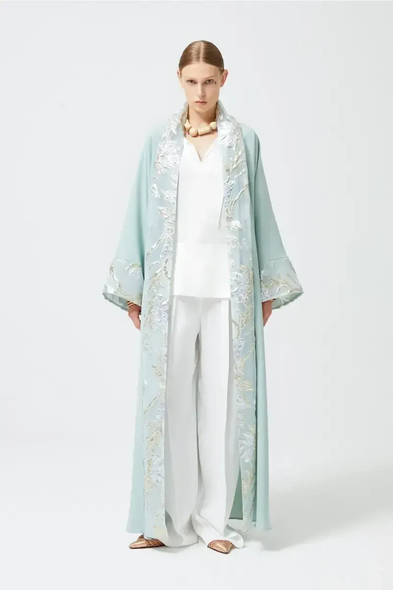 Capture the perfect harmony of elegance and style with the Brocade Embellished Abaya Mint Green & Shawl-Mint Green. Offering all-day comfort with the lightness and comfort of imported Aerobin fabric, this abaya allows you to have a striking appearance thanks to its special brocade details. This abaya, one of the most trendy pieces of the new season hijab fashion, is an ideal choice for both daily use and special occasions. The mint green color of the abaya reflects the freshness of summer, while the brocade trim adds a sophisticated touch to the design. With a length of 140 cm, this abaya, which completely covers the body and fulfills the requirements of hijab clothing, also offers a stylish and modern look. Thanks to its unlined structure, the abaya, which has high air permeability, does not cause sweating even in hot weather and allows you to be comfortable all day long. The detachable sash detail allows you to adjust the waist of the abaya as you wish, while making your silhouette more defined. The elastic detail on the sleeve cuffs provides both ease of use and adds a modern touch to the overall design of the abaya. The shawl that comes with the abaya is compatible with the color of the abaya, completes your combination and offers you a complete look. This abaya, which offers a long-lasting use thanks to the quality of the imported Aerobin fabric and careful workmanship, will be one of the indispensable pieces of your wardrobe. Please keep in mind that there may be tonal differences in the product color due to concept shots. However, the actual color of the product reflects the most vibrant and fresh tone of mint green. Attract attention in every environment with the Brocade Embellished Abaya Mint Green & Shawl-Mint Green and let your style speak for itself. This special design abaya brings a new breath to hijab fashion and offers elegance and comfort together. This abaya, which you can choose for both daily use and special occasions, is a candidate to be one of the most valuable pieces of your wardrobe. Carry the energy of summer with its mint green color and highlight your elegance with brocade details.