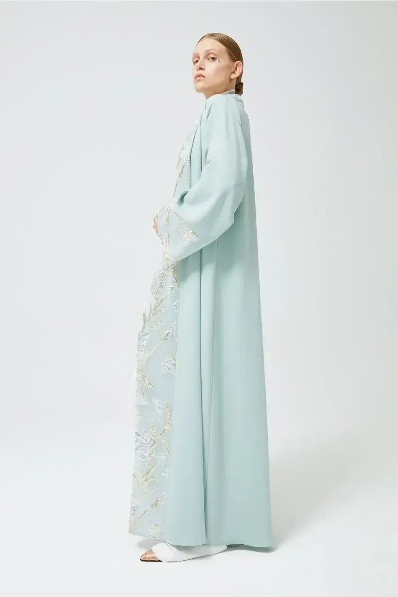Abaya, tesettür, mint yeşili, brokar, şal, aerobin kumaş, yeni sezon, kuşaklı abaya, uzun abaya, tesettür moda