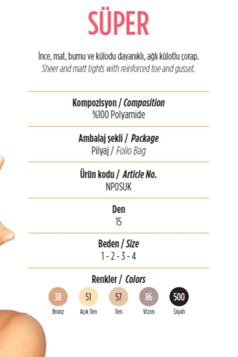 Bronz 38 Numara Süper Mat 15 Denye İnce Ağlı Külotlu Çorap, zarafetin ve konforun mükemmel birleşimini sunar. Teninizi kusursuz bir şekilde saran bu çorap, bacaklarınıza doğal bir bronzluk katarken, süper mat dokusu sayesinde parlama yapmaz ve her ortamda şık görünmenizi sağlar. İnce yapısı sayesinde gün boyu rahatlıkla kullanabileceğiniz bu külotlu çorap, özel ağlı deseni ile de dikkat çekici bir görünüm sunar. İster günlük kullanımda, ister özel davetlerde, Bronz 38 Numara külotlu çorap, tarzınızı tamamlayacak ve size özgüven katacaktır. Geliştirilmiş dayanıklılığı sayesinde uzun ömürlü kullanım imkanı sunan bu çorap, gardırobunuzun vazgeçilmez bir parçası olmaya aday. İnce olmasına rağmen burnu ve külodu özel olarak güçlendirilmiştir, böylece yırtılma ve sökülmelere karşı ekstra direnç gösterir. Külot kısmındaki ağlı tasarım, hem şık bir detay oluşturur hem de konforlu bir kullanım sağlar. Bronz rengi, her türlü kıyafetle kolayca kombinlenebilir ve bacaklarınıza pürüzsüz bir görünüm verir. 38 numara bedeni, ideal bir uyum sağlayarak hareket özgürlüğünüzü kısıtlamaz. Bronz 38 Numara Süper Mat 15 Denye İnce Ağlı Külotlu Çorap ile hem şıklığı hem de rahatlığı bir arada yaşayın. Bu çorap, modern kadının stil sahibi duruşunu destekleyen, kaliteli ve kullanışlı bir seçenektir. Gün boyu süren konforu ve zarif görünümü ile kendinizi özel hissedeceksiniz. İster eteklerle, ister elbiselerle, ister pantolonlarla kombinleyin, her zaman şık ve bakımlı görünmenizi sağlar. Bronz 38 Numara Süper Mat 15 Denye İnce Ağlı Külotlu Çorap, sadece bir çorap değil, aynı zamanda bir stil ifadesidir.