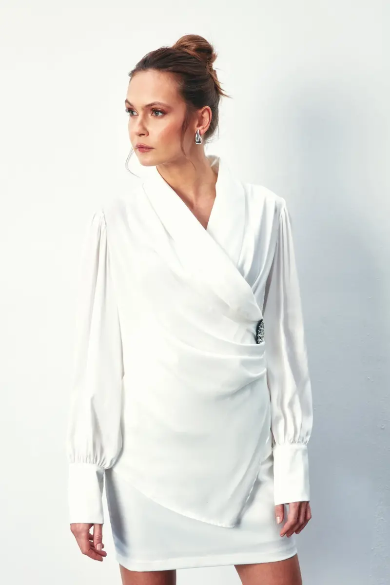 The Brooch Wrap Blouse, specially designed for the Design collection, is a candidate to be an indispensable part of your wardrobe by combining elegance and modern lines. This blouse, which easily adapts to any combination with the nobility of its ecru color, offers a sophisticated look thanks to its wrap-over collar detail. This design, which will highlight your elegance whether for daily use or a special occasion, will appeal to stylish women. Its standard length provides a perfect fit for different body types, while its comfortable cut offers a comfortable wearing experience all day long. The high-quality 100% polyester material ensures the blouse is long-lasting and easy to care for. In this way, you get a practical use without sacrificing your elegance even in your busy schedule. The brooch detail adds a different touch to the blouse, while its plain pattern allows it to be easily combined with different accessories and bottoms. Its long-sleeved design provides ideal protection during seasonal transitions, making it a piece that you can use in all seasons. Its basic silhouette offers a timeless elegance by harmonizing with all kinds of bottoms. Whether you create a daily combination with jeans or achieve a more elegant look with skirts, the Brooch Wrap Blouse will accompany you in any situation. Being suitable for Type 1 washing instructions shows how practical it is to clean and ensures that the blouse retains its shape for a long time. This blouse stands out not only as a stylish but also as a functional piece. It is a timeless and versatile option that should be in your wardrobe.