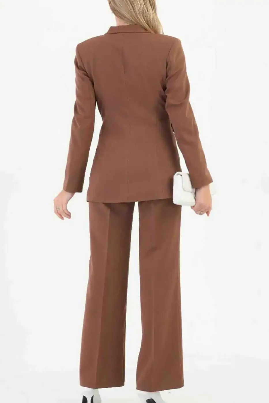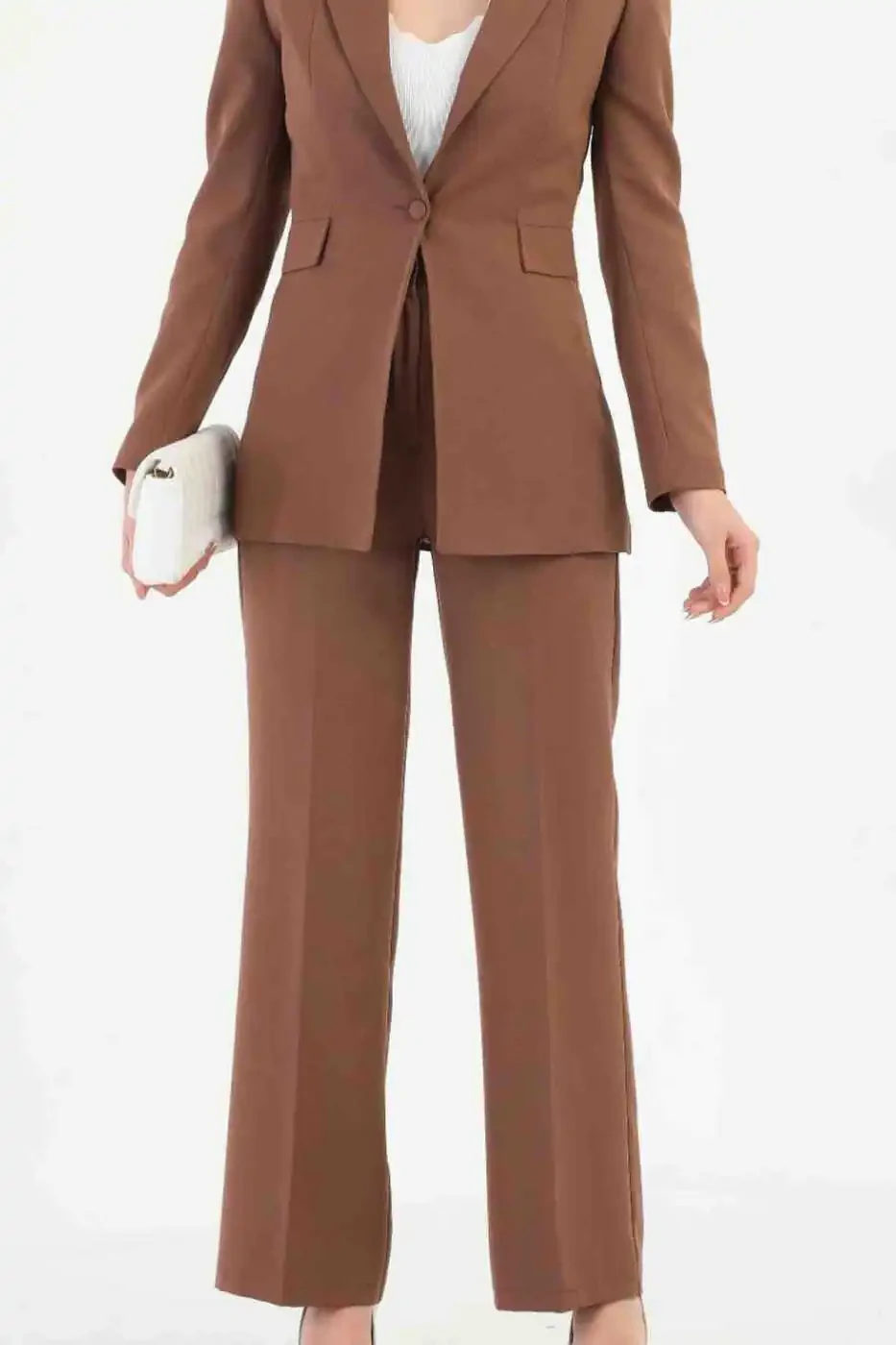 Look flawless anytime, anywhere with this stylish suit that combines elegance and comfort. The brown palazzo blazer jacket features a sleek cut, single button design, and stylish pocket details, while the matching belted trousers offer a comfortable and stylish look.