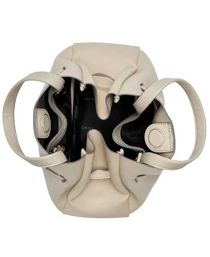 Combining timeless elegance with modern functionality, this DKNY satchel features polished silver hardware with signature logo details. Small-sized bag; 8-1/4"W x 6-2/5"H x 3-3/4"D (width is measured across the bottom of handbag); 0.82 lb. approx. weight Silhouette is based on 5'9" model 4"L double handles; 23"L adjustable strap Snap closure Silver-tone exterior hardware, 1 back zip pocket, 1 back slip pocket, 1 front slip pocket Body and trim: 100% polyurethane; lining: 100% polyester Spot clean Imported