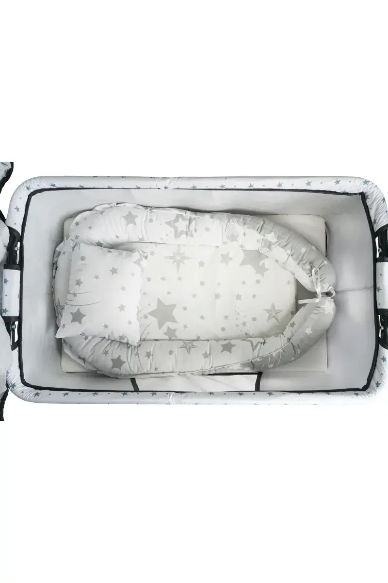 Комплект детской кроватки-качалки Btrend Babynest с матрасом и подушкой, гамаком и карманом в подарок обеспечит комфортные и безопасные условия для сна вашего ребенка. Этот набор бежевого цвета имеет стильный внешний вид и предназначен для использования как в качестве люльки, так и в качестве матраса Babynest. Таким образом, вы можете найти все, что нужно вашему ребенку в первые месяцы, в одном продукте. Этот специальный набор производится с учетом комфорта и безопасности вашего ребенка. Кроватка с функцией качания помогает вашему ребенку легко заснуть, а матрас Babynest обнимает вашего ребенка и заставляет его чувствовать себя в безопасности, как в утробе матери. Изготовлена из 100% хлопчатобумажной ткани, не повреждает нежную кожу вашего ребенка и сводит к минимуму риск аллергических реакций. Отсутствие канцерогенных веществ в ткани имеет большое значение для здоровья вашего ребенка. Комплект детской кроватки-качалки Btrend Babynest не только обеспечивает комфортное спальное место, но и облегчает жизнь родителям благодаря практичному использованию. Внутренние и внешние размеры кроватки разработаны таким образом, чтобы ваш ребенок мог свободно двигаться и чувствовать себя в безопасности. Поскольку грузоподъемность составляет 20 кг, вы можете использовать ее в течение длительного времени в процессе роста вашего ребенка. Возможность стирки матраса Babynest при 30 градусах является большим преимуществом с точки зрения чистоты. Этот комплект из 2 предметов обладает всеми характеристиками, которые вам понадобятся в первые месяцы жизни вашего ребенка. Кроватка-качалка облегчает засыпание вашего ребенка, а матрас Babynest обеспечивает вашему ребенку безопасную и теплую среду, как в утробе матери. Бежевый цвет сочетается с любым декором детской комнаты и создает стильный внешний вид. Этот набор, произведенный с качеством Btrend, является идеальным выбором для родителей, которые хотят лучшего для своего ребенка. Возможность использования как в качестве люльки, так и в качестве детского гнездышка делает этот набор экономичным и практичным решением. Выбрав комплект матраса и подушки Btrend Babynest для комфорта и безопасности вашего ребенка, вы можете обеспечить ему спокойный сон.