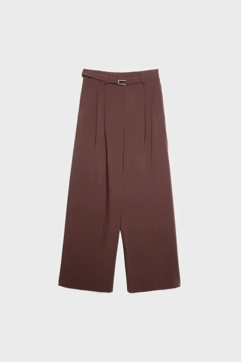 Add elegance and comfort to your wardrobe with the Buckled Belt Detailed Wide Leg Pants. This pants, which easily adapts to any combination with its dark brown color, is offered with Stradivarius quality. It provides comfort all day long with its high waist cut and draped structure, while it dazzles with its stylish details. Thanks to the elasticated waist detail on the back, it fits your body perfectly. The adjustable metal buckled belt loop on the front adds a modern and unique touch to the trousers. It offers usability with its side pockets and makes it easy to carry your important belongings with you. Its straight and wide leg design does not restrict your freedom of movement. The front pleat details enrich the stance of the trousers. It can be easily put on and taken off thanks to the front zipper, inner button and metal hook closure system. These trousers are an ideal choice for both daily use and special occasions. The model is 172 cm tall and wears size 36. The dark brown tone will be indispensable for autumn and winter months. These trousers, which are a perfect choice for those looking for elegance and comfort together, are candidates to be the most favorite piece of your wardrobe. Don't miss these trousers that will reflect your style and give you confidence! With its buckled belt detail, wide cut and comfortable structure, these trousers will make you stand out in any environment. Whether you make a stylish combination with heels or create a more comfortable style with sneakers, these trousers will accompany you in any case. These trousers, which will make you feel good every moment of the day, will be an indispensable part of your wardrobe. Enjoy being both stylish and comfortable with these trousers. It can be easily combined with all kinds of tops with its dark brown color and allows you to create different styles.
