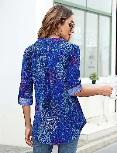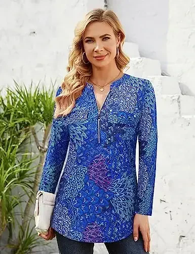 Bulotus Women's Zip Up V Neck 3/4 Sleeve Work Blouses are a design that combines elegance and comfort and is a candidate to be an indispensable part of your wardrobe. Thanks to its soft and breathable cotton fabric, it offers comfort all day long and adapts to any environment, from business life to daily use. This blouse attracts attention with its modern zippered V-neck, while also offering versatile use. You can achieve a more formal look by closing the zipper completely, or create a more relaxed and attractive style by opening it halfway. The 3/4 length sleeves are an ideal choice especially in spring and summer, and can be easily combined in cool weather. Buttoned straps on the sleeve details and flap pockets on the front enhance the blouse's elegance and originality. This blouse, which allows you to look perfect at all times thanks to its wrinkle-resistant and easy care, also fits your body perfectly with its flexible structure. Whether you create a stylish combination with custom-made trousers, or capture a more sporty style with leggings or jeans, this blouse will complete your style in any situation. Combine it with a cardigan in cold weather to stay warm and maintain your elegant look. Offering options suitable for every body type thanks to its wide size range (S-5XL), the Bulotus blouse is ideal for all kinds of events, from business meetings to family gatherings, from daily coffee dates to special invitations. Please make sure you choose the size that suits you best by checking the size chart before ordering. This loose-fitting tunic-style blouse can be easily dressed up or dressed down, making it a versatile choice.
