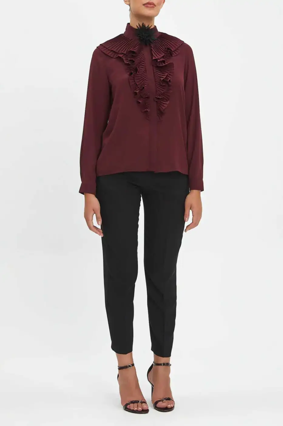 ## Buttoned Maroon Shirt with Collar Frill and Flower Brooch