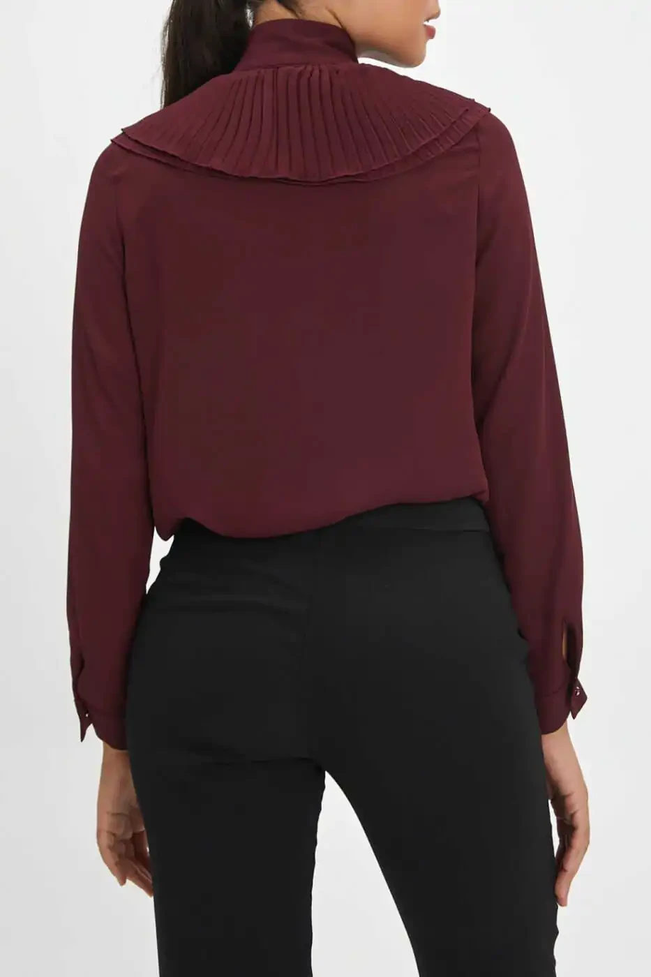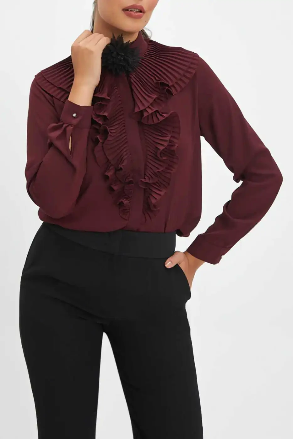 This maroon shirt offers a feminine and elegant style. The shirt has buttons on the front, while the collar features a charming frill detail. In addition, the flower-shaped brooch that adorns the shirt completes the elegance.