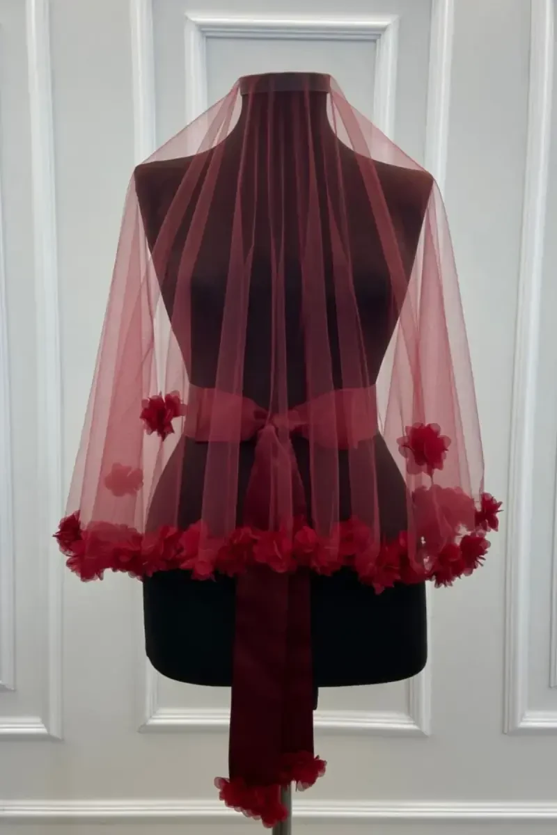 Step into an unforgettable beginning with the Burgundy Three-Dimensional Bridal Veil Set, which adorns the dreams of prospective brides on their most special days, offering elegance and grace together. This unique set will add a whole new dimension to your wedding dress by combining the nobility of burgundy with the magic of three-dimensional flower details.**Product Description**The Burgundy Three-Dimensional Bridal Veil Set will make you feel like the heroine of a fairy tale on your wedding day. Carefully designed in every detail, this set ensures a dazzling look by providing a perfect harmony with your wedding dress. The warmth and depth of burgundy create a striking effect by contrasting with the white tones of your wedding dress. Three-dimensional flower appliques add movement and vitality to the veil, creating a romantic atmosphere. The light and flowing texture of the veil highlights your elegance with every movement. The veil in the set is made of high-quality tulle fabric and preserves its beauty as on the first day for many years. The softness of the tulle gently touches your skin, ensuring you feel comfortable throughout the day. The three-dimensional flowers on the veil are meticulously placed with hand workmanship. The color and texture of each flower have been carefully selected to match the overall design of the veil. The shine of the flowers combines with the sparkle of your wedding dress, making you shine like a star. The Burgundy Three-Dimensional Bridal Veil Set is not only limited to the veil but can also be easily combined with other accessories of your wedding dress. The other pieces in the set are specially designed to complement the design of the veil. Burgundy color creates a perfect harmony with gold, silver, and pearl details. In this way, you can create a perfect look by choosing jewelry and shoes that match your wedding dress. This special set will leave an unforgettable mark not only on your wedding day but also on your wedding photos. The elegant stance of the veil and the details of the three-dimensional flowers will add depth and meaning to your photos. Even when you look at it years later, it will remain as a memory where you will relive the excitement and happiness of that day. Turn your dreams into reality on your most special day with the Burgundy Three-Dimensional Bridal Veil Set and become an unforgettable bride.**Product Features*** Made of high-quality tulle fabric.* Burgundy color.* Decorated with three-dimensional flower appliques.* Has a light and flowing texture.* Easily adapts to your wedding dress.* Provides a stylish look in your wedding photos.* Handmade.* Long-lasting.* Made of materials that do not harm the skin.* Can be combined with different wedding dress models.**Additional Information**The veil should be dry cleaned. It is recommended to keep the product away from substances containing perfume and alcohol to avoid damage. The set includes a veil and other accessories suitable for its design (accessories may vary, please read the product description carefully). The product is carefully packaged and shipped. All necessary precautions have been taken to prevent damage during transportation.