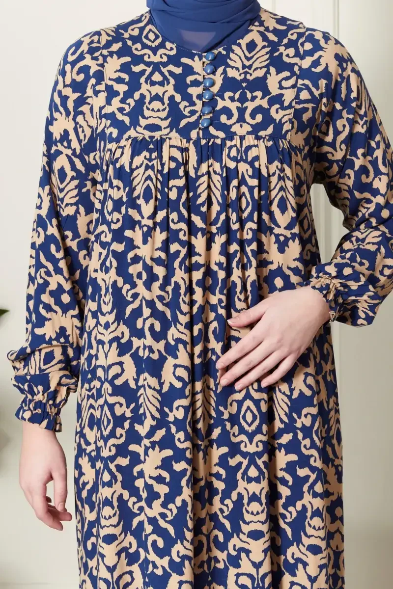 Платье для мусульманок для беременных и кормящих матерей из вискозной ткани с оборками и пуговицами спереди для молитвы - этнический узор синего цвета - это специальный дизайн, сочетающий в себе элегантность и комфорт. Это платье, которое вы можете с комфортом носить в своей повседневной жизни, на особых мероприятиях или во время молитвы, позволяет вашей коже дышать благодаря ткани из 100% хлопкового вискозного волокна и обеспечивает комфортное использование в течение всего дня. Синий цвет с этническим рисунком придает платью неповторимый вид, а оборки и пуговицы спереди придают ему женственный вид. Вырез под горло создает современный вид, а длинные рукава позволяют вам оставаться в тепле, не жертвуя своим стилем в холодную погоду. Это платье для мусульманок можно с комфортом носить в любой обстановке благодаря непрозрачной ткани. Обычный крой не ограничивает вашу свободу движений, мягко подчеркивая линии вашей фигуры. Длинный подол помогает вам выглядеть элегантно. Отсутствие карманов придает ему минималистский шик, а вискозное плетение дарит ощущение мягкости. Цветочный узор придает платью живость, делая его универсальным предметом одежды, который можно носить в любое время года. Эту модель, которую также можно использовать как платье для беременных и кормящих матерей, можно с уверенностью носить на особых мероприятиях и вечеринках благодаря удобному крою и элегантному дизайну. Это платье, которое также подходит для молитвы, разработано в соответствии с принципами мусульманской одежды. Вы можете сохранить это платье как новое в течение длительного времени, следуя инструкциям по стирке, и сделать его одним из незаменимых предметов вашего гардероба. Откройте для себя это уникальное платье, которое дополнит ваш повседневный шик и будет сопровождать ваши особые моменты.