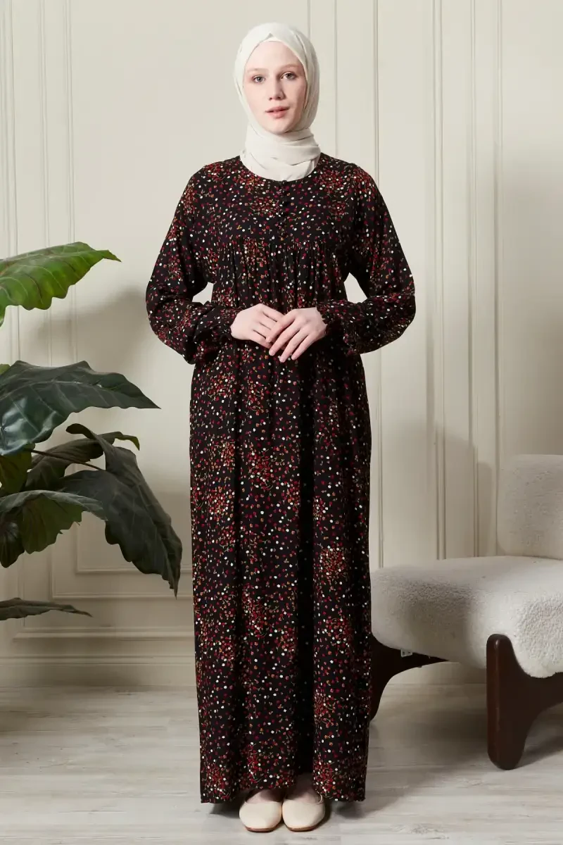 Платье-миди для мусульманок из вискозной ткани с оборками, пуговицами спереди, для намаза, с цветочным принтом, черного цвета – это особый дизайн, сочетающий в себе элегантность и комфорт. Это платье, представленное Чингисханом Балджи, обеспечивает воздухопроницаемость и комфорт в течение всего дня благодаря ткани из 100% хлопка. Не просвечивающая структура делает его идеальным для повседневного использования, поэтому вы можете с уверенностью носить его в любой обстановке. Подходящий для любого сезона дизайн сделает его незаменимым в вашем гардеробе в любое время года. Базовый силуэт легко комбинируется с различными аксессуарами, поэтому он подходит к любой одежде. Дизайн без пояса создает современный и минималистичный вид, а круглый вырез горловины создает простой и элегантный стиль. Отсутствие подкладки увеличивает легкость и обеспечивает свободу движений, а ткань из терри-вискозы оставляет ощущение гладкости на коже. Это платье, специально разработанное для коллекции мусульманской одежды, сочетает в себе элегантность и необходимость прикрытия. Благодаря своему модному дизайну оно занимает свое место в гардеробе женщин, следящих за тенденциями. Детали с пуговицами обеспечивают практичное использование и эстетичный внешний вид. Дизайн без карманов подчеркивает минимализм и имеет современные линии. С одной упаковкой вы получаете только необходимое платье. Это платье, созданное для женщин/девочек, может понравиться каждому. Длинный подол делает ноги длиннее, чем они есть на самом деле, и создает элегантный вид. Происхождение TR гарантирует соответствие местным стандартам производства и прошло контроль качества. Стандартный крой обеспечивает соответствие фигуре и позволяет свободно двигаться. Тип трикотажной ткани обеспечивает эластичность и сопровождает вас во всех ваших повседневных занятиях. Это платье, которое можно с уверенностью носить в повседневной обстановке, станет идеальным вариантом, который вы сможете носить с собой куда угодно, от работы до покупок. Благодаря вискозному материалу оно хорошо пропускает воздух и идеально подходит для летних месяцев, но также может использоваться в холодную погоду. Длинные рукава защищают от сезонных изменений и полностью защищают от холода. Длинные рукава полностью закрывают руки и соответствуют принципам мусульманской одежды. Цветочный узор подчеркивает женственные детали и помогает создать эффектный стиль. Это платье — идеальный выбор для женщин, которые хотят быть одновременно элегантными и удобными. Эта вещь, которая обязательно должна быть в вашем гардеробе, придаст вам уверенности в любой обстановке.