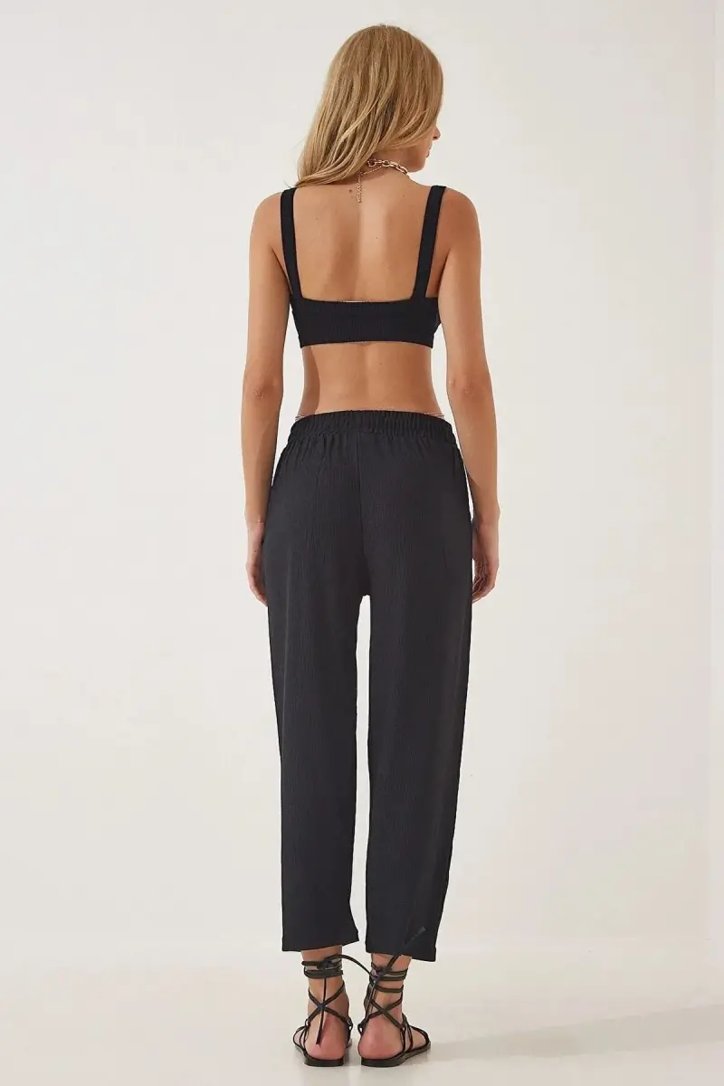 Брючный костюм-кимоно из жатой ткани - черный - это дизайн, который объединяет в себе элегантность и комфорт и является кандидатом на то, чтобы стать незаменимой частью гардероба современной женщины. Этот специальный костюм позволит вам выделиться как в повседневной жизни, так и на светских мероприятиях. Уникальная текстура жатой ткани и благородный вид черного цвета позволяют вам демонстрировать эффектный стиль в любой обстановке. Сочетание верха кроя кимоно и брюк широкого кроя создает элегантный силуэт, не ограничивая вашу свободу движений.Описание товараБрючный костюм-кимоно из жатой ткани - черный - идеальный выбор для женщин, которые ищут современный и удобный стиль. Верхняя часть кроя кимоно ниспадает от плеч и придает телу приятный вид. Брюки широкого кроя сочетают в себе комфорт и элегантность. Легкая помятость жатой ткани придает костюму естественный и богемный вид, а благородство черного цвета легко сочетается с любым образом. Этот костюм можно носить как с кроссовками в повседневной жизни, так и с туфлями на каблуках на светском мероприятии. Вы можете создать разные стили с помощью выбора аксессуаров и, таким образом, отразить свой собственный стиль в любой обстановке. Брючный костюм-кимоно из жатой ткани - черный станет одним из самых универсальных предметов вашего гардероба и всегда позволит вам чувствовать себя стильно и комфортно. Кроме того, благодаря дышащей структуре ткани он удобен даже в летние месяцы. Крой костюма разработан таким образом, чтобы соответствовать разным типам фигуры, что делает его идеальным вариантом для всех. Тот факт, что жатая текстура не требует глажки, также обеспечивает простоту использования. Этот костюм станет незаменимым в вашем гардеробе на долгие годы благодаря своему вневременному дизайну и качественной ткани. Этот костюм, который вы можете легко предпочесть как в деловой жизни, так и на светских мероприятиях, позволит вам подчеркнуть свою элегантность, не жертвуя при этом своим комфортом. Классическая элегантность черного цвета позволяет легко адаптироваться к любому вашему образу. Этот костюм — не просто одежда, это выражение образа жизни. Брючный костюм-кимоно из жатой ткани - черный станет правильным выбором для вас каждый раз, когда вы захотите почувствовать себя особенной и выразить свой стиль. Этот костюм, который спасет ваш гардероб, — практичное решение, которое позволит вам всегда выглядеть стильно и ухоженно.Характеристики продукта* Верх кроя кимоно* Брюки широкого кроя* Текстура жатой ткани* Черный цвет* Удобный и стильный дизайн* Подходит для разных типов фигуры* Дышащая структура ткани* Ткань, не требующая глажки* Подходит для повседневного и особого использования* Универсальная сочетаемостьДополнительная информацияРазмер модели: S/36. Состав ткани: 100% вискоза. Инструкции по стирке: Стирать при 30 градусах с вещами аналогичного цвета. Не используйте отбеливатель. Можно гладить при низкой температуре. Возможна химчистка.