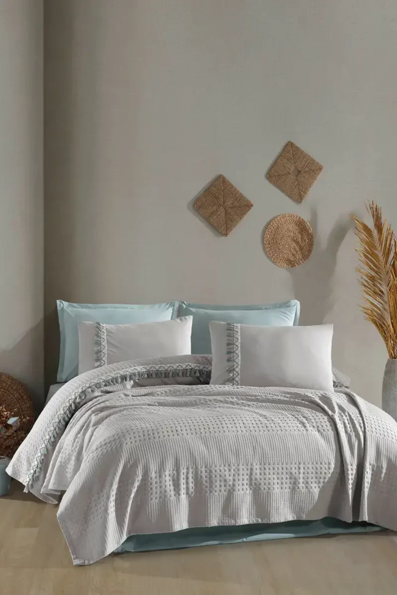 pike takımı, çift kişilik, pamuk, püsküllü, bohem, gri, yatak örtüsü, yastık kılıfı, butik, nevresim