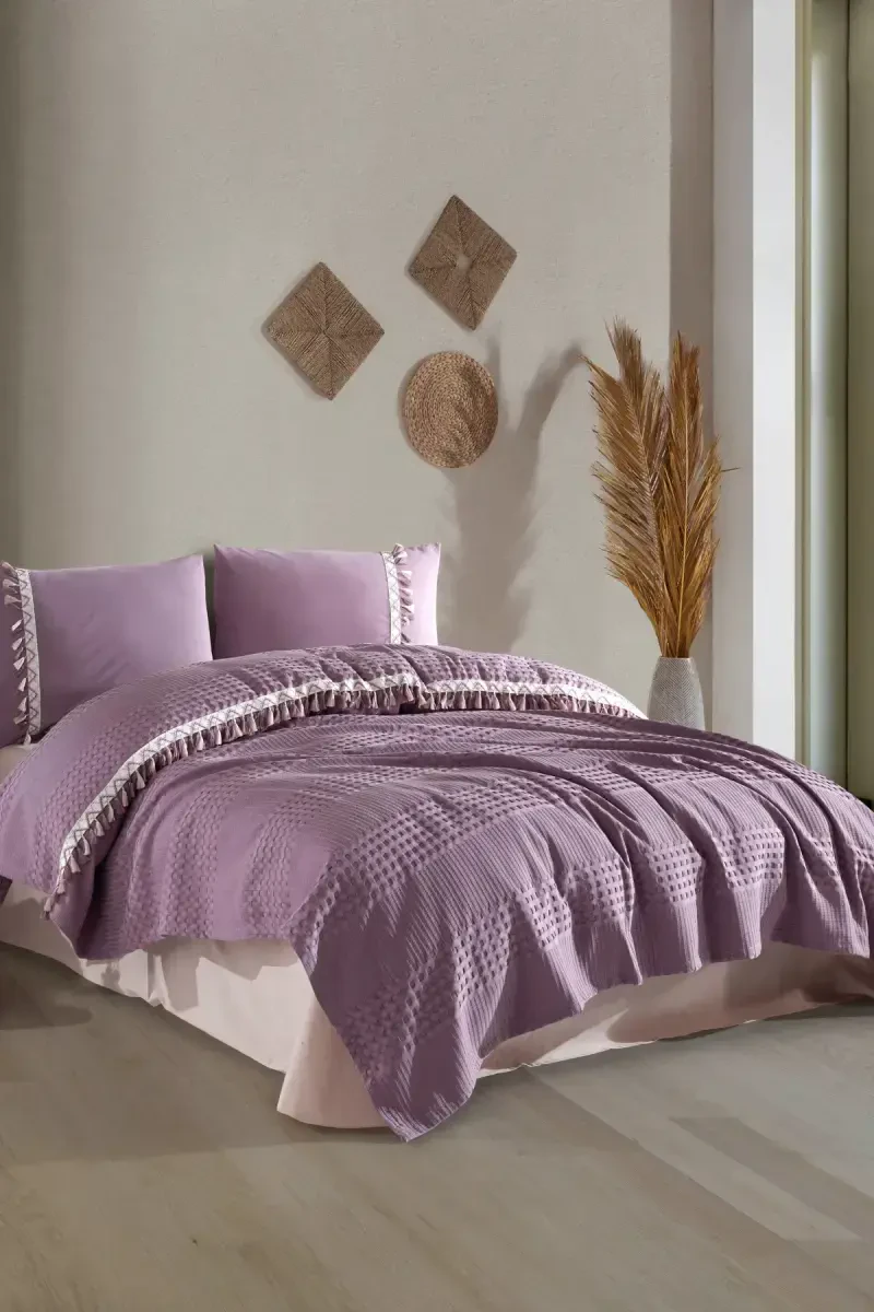 çift kişilik pike takımı, püsküllü pike, bohem pike, lila pike, pamuklu pike, yatak örtüsü, çift kişilik yatak örtüsü, butik pike, bohamline lila, yatak odası tekstili