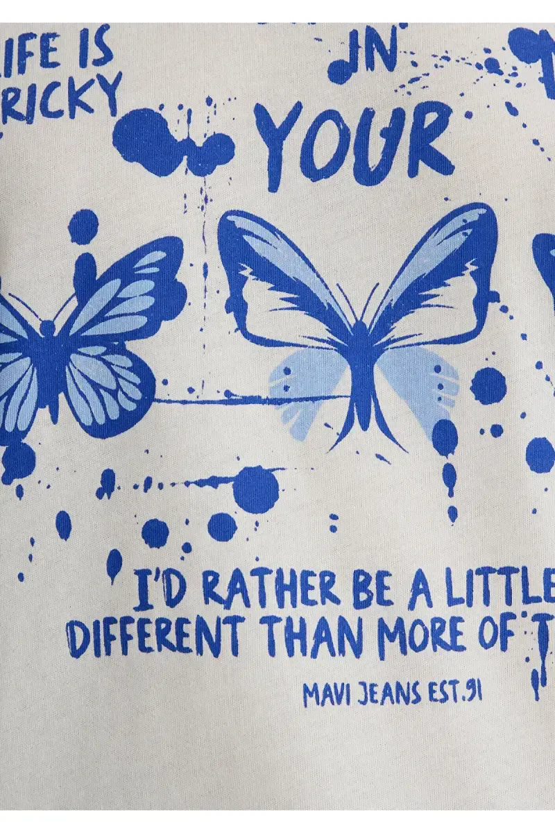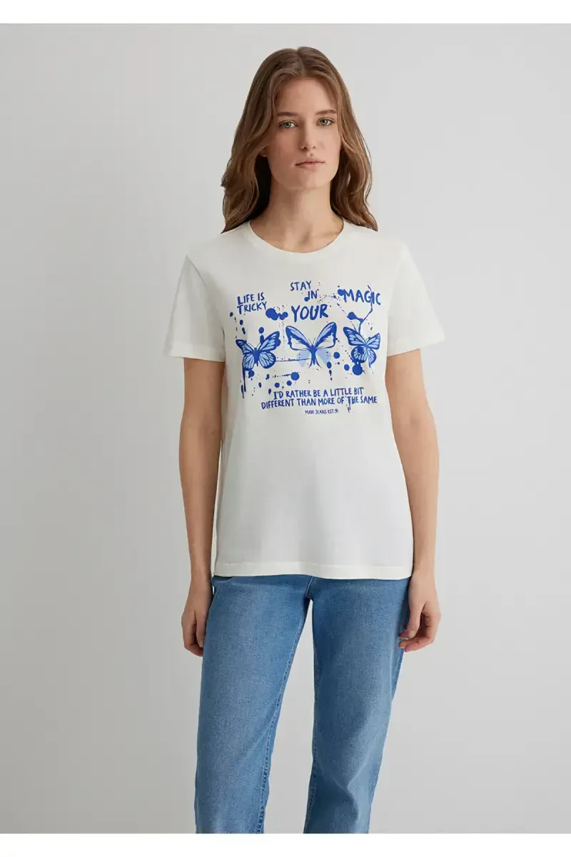 Free your style with the Butterfly Print Ecru T-Shirt! This special design t-shirt attracts attention with its modern cut and elegant details. The semi-D collar adds a sophisticated touch to the t-shirt, while the semi slim fit fits the body nicely, creating a stylish silhouette. The ecru color offers a perfect base for any combination, while the vibrant butterfly print adds a dynamic and fun touch to the t-shirt. This t-shirt, which you can easily prefer for daily use as well as special occasions, is a candidate to be one of the most loved pieces of your wardrobe. Thanks to its high-quality cotton fabric, this t-shirt, which offers a breathable and soft touch, provides a comfortable wearing experience all day long. The vibrant colors and detailed workmanship of the butterfly print add an artistic touch to the t-shirt, while also offering the opportunity to reflect your style. Whether you make a sporty combination with jeans or get a more special look with a stylish skirt, the Butterfly Print Ecru T-Shirt will help you express your style in any environment. This t-shirt, which will maintain its appearance like the first day for many years thanks to the durability of the fabric and the quality of the print, is a choice that respects both you and nature. The Butterfly Print Ecru T-Shirt, which is an ideal option for anyone who follows fashion and likes to dress originally and comfortably, is a must-have in your wardrobe. You will always feel stylish and comfortable with this t-shirt that will accompany you in your daily activities and special meetings. Discover the Butterfly Print Ecru T-Shirt now to feel special and reflect your style!