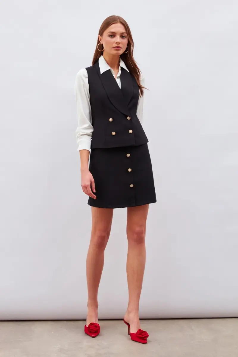 This mini skirt, combining style and comfort, will become an indispensable part of your wardrobe. The skirt, featuring elegant button details, will easily adapt to any combination with its black color. The high waist cut will give your silhouette an elegant look, while the mini length will highlight your femininity.