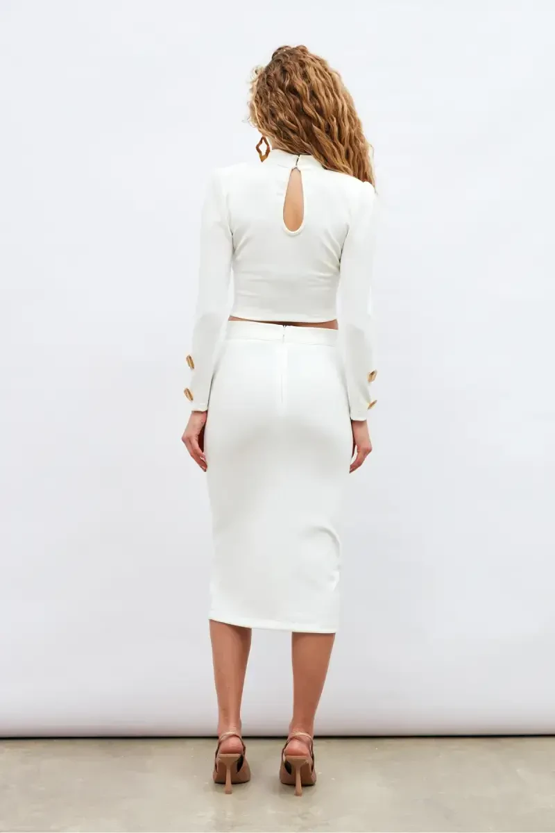 The button detailed pencil skirt, which combines elegance and grace, is one of the essential pieces that every woman should have in her wardrobe. The ecru color adapts to every combination, helping you to create a stylish look for both everyday and special occasions.