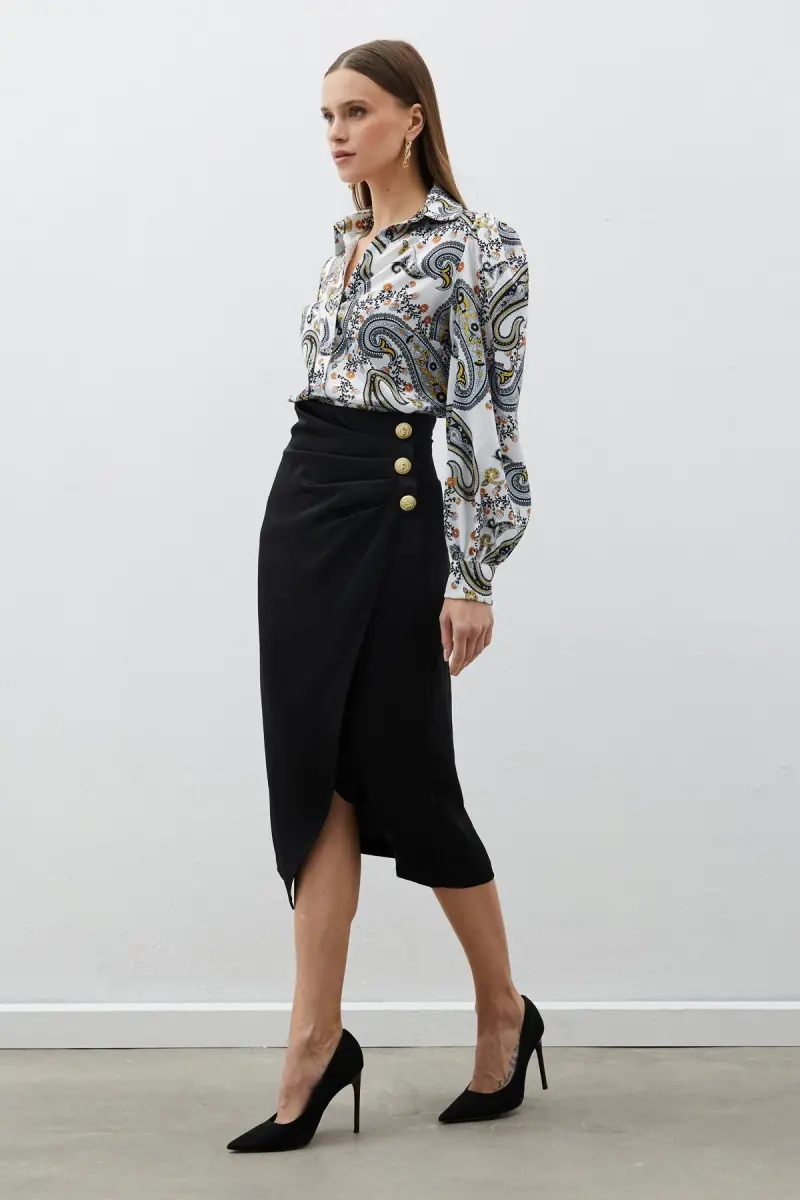 Button-Detailed Satin Crepe Skirt - Black is a special design that combines elegance and grace. Carefully produced by Echo Design, this skirt is a candidate to be an indispensable part of your wardrobe. Thanks to its high-quality satin crepe fabric, it has an eye-catching shine and offers comfortable use all day long. The black color of the skirt creates a perfect base for all kinds of combinations, while the decorative gold buttons add a sophisticated touch to the design. Its wrap-over cut elegantly reveals your body lines, while its midi length offers a stylish look suitable for both daily use and special occasions. The zipper on the back makes the skirt easy to put on and take off. The high-waisted design makes your waist look slimmer and creates a stylish silhouette. This skirt is an ideal choice for women who embrace both classic and modern styles. Whether you're preparing for a special night with a stylish blouse and heels, or catching everyday elegance with a basic t-shirt and sneakers, the Button-Detailed Satin Crepe Skirt - Black will complement your style and add confidence in every situation. The 36/S size on the model best shows the fit and stance of the skirt, while different size options offer a suitable alternative for every body type. This special design skirt is offered with Trendyol assurance. A product may be sold by more than one seller. The sellers of products offered for sale by more than one seller are ranked according to the price they determine for the product, seller scores, delivery statuses, promotions on the products, whether the cargo is free or not, whether the products can be delivered with fast delivery, and the stock and category information of the products. Order now so you don't miss out on this product that is available in limited stock. Remember, you can order a maximum of 10 of this product. Trendyol reserves the right to cancel orders over 10 units. This limit is not valid for corporate orders, and different limits may be determined for corporate orders. In addition, if you do not like the product, you can return it free of charge within 15 days. For detailed information, you can visit the return conditions page.