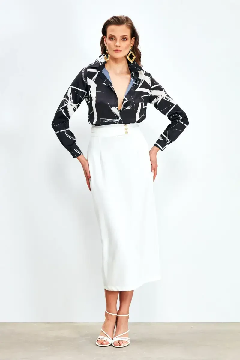 This midi skirt, which combines elegance and comfort, will be an indispensable part of your wardrobe. The high waist, side zipper and back slit details give it a stunning look, while the decorative buttons on the waist complete its elegance and highlight your style.