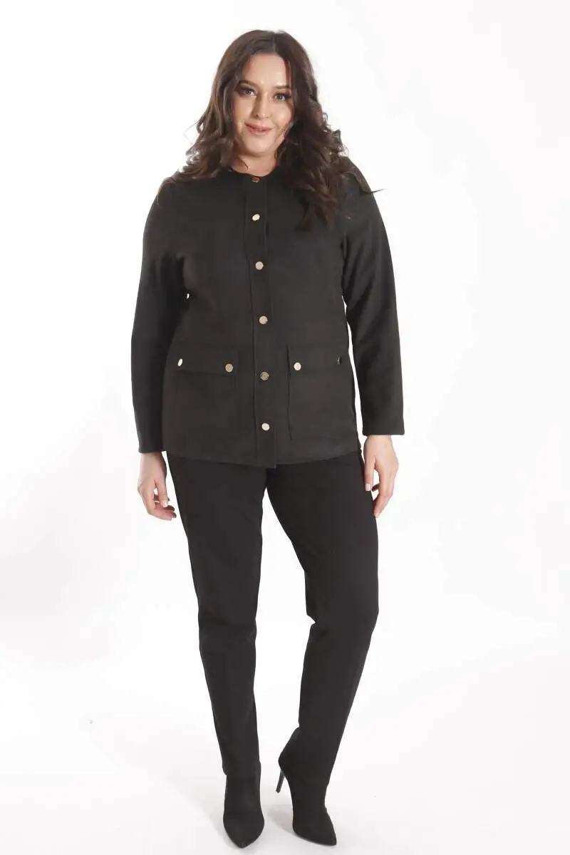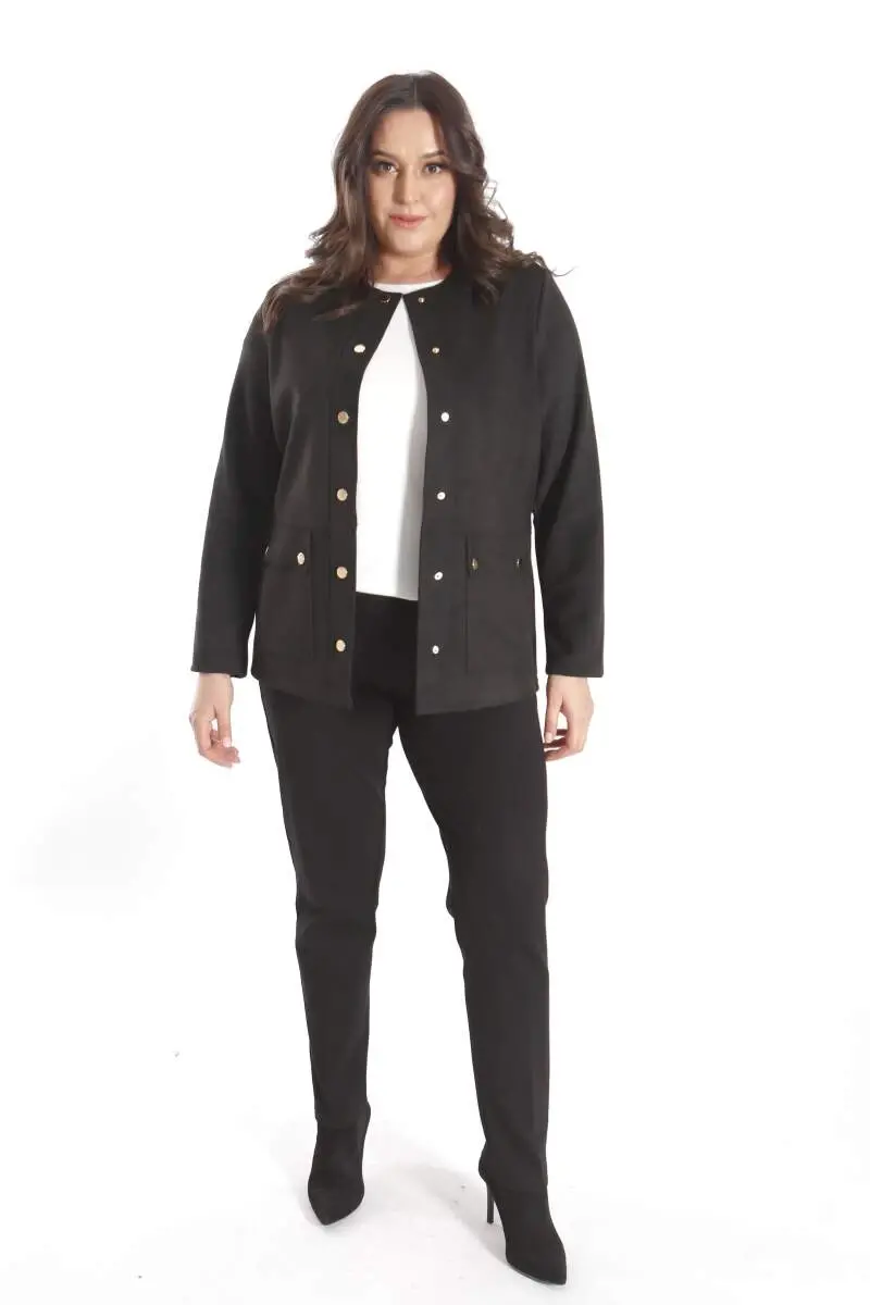 Büyük Beden Bisiklet Yaka Çıt Çıt Düğmeli Siyah Süet Ceket