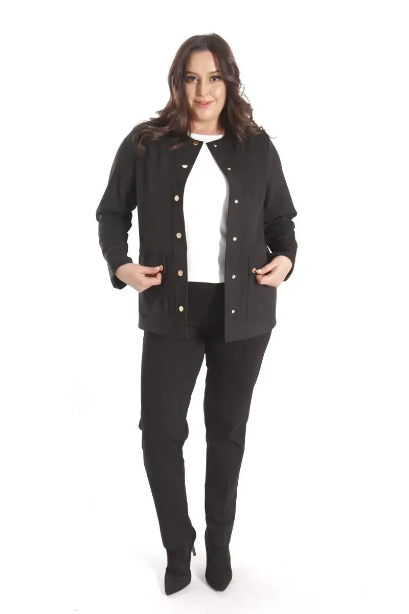 Angelino Büyük Beden Bisiklet Yaka Çıt Çıt Düğmeli Siyah Süet CeketÜrün Özellikleri: Hafif ve yumuşak dokuya sahipRahat form kesimCep detayı ile şık görünümKalça üstü boyBisiklet yakaÜrün Açıklaması: Angelino Büyük Beden Bisiklet Yaka Çıt Çıt Düğmeli Siyah Süet Ceket, süet malzemeden üretilen, yumuşak dokusu ile dikkat çeken rahatlığı ile günlük yaşamın ayrılmaz parçası. Cep ve düğme detayı ile şık bir tasarım. Bluz, gömlek, pantolon ve eteklerinizle rahatlıkla kombinleye bileceğiniz Büyük Beden Cep Detaylı Siyah Süet Ceket.Renk: SiyaModazonealzeme: %93 Poliester %7 ElastanManken Ölçüleri: Omuz: 47 cm. - Göğüs: 97 cm. - Basen: 105cm - Bel: 80 cm. - Boy: 1,79 cm. Ürün boyu 70 cm. 'dir.Model Bedeni: 44