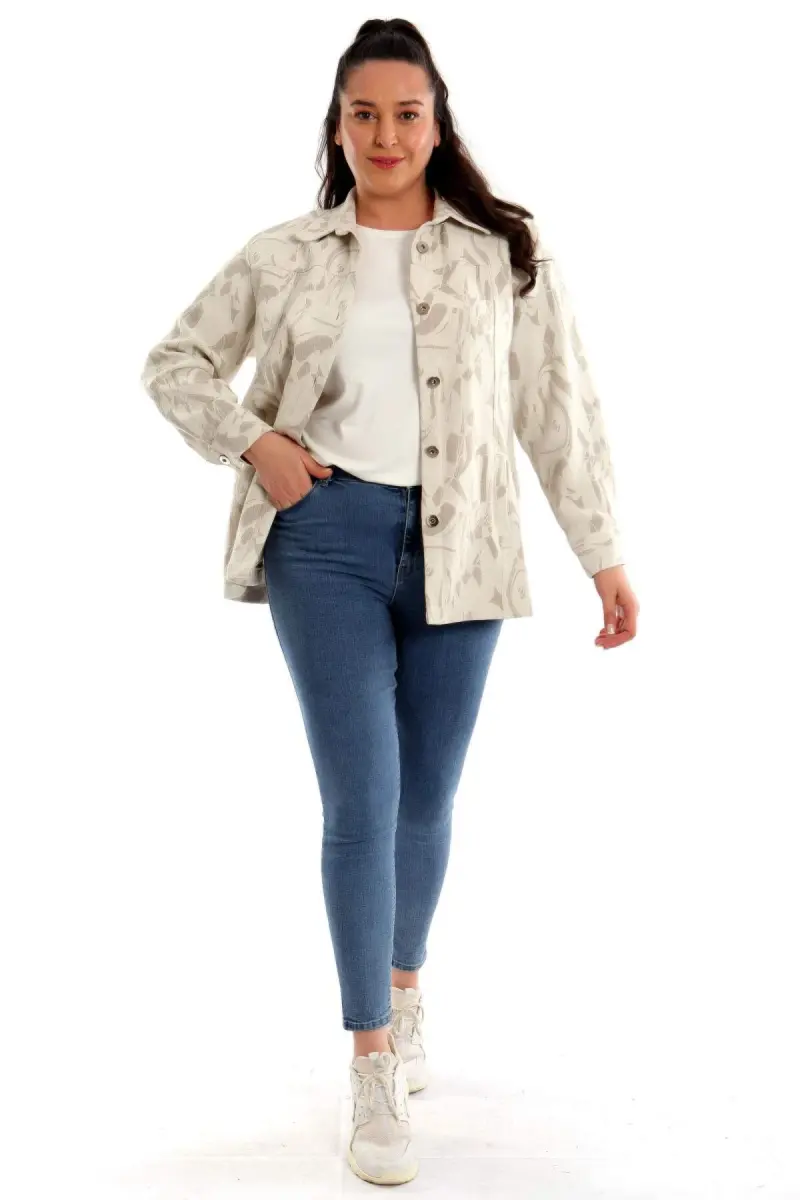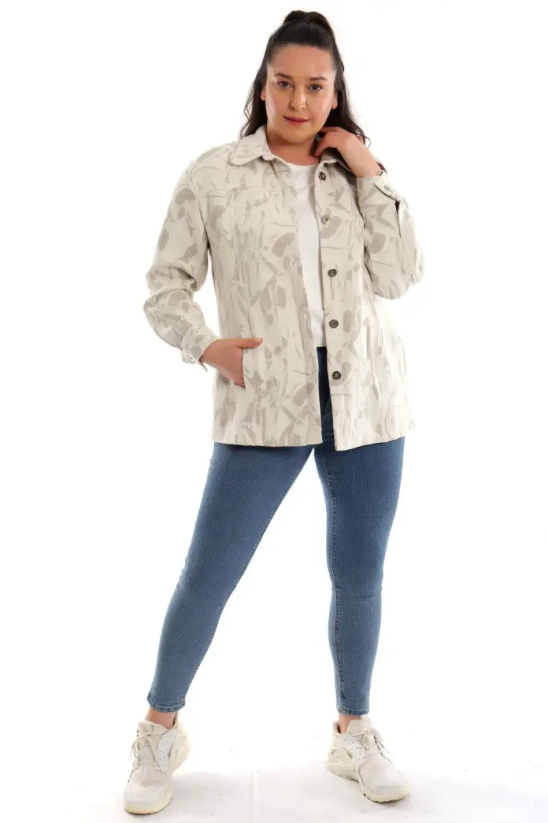 Büyük Beden Çakma Düğmeli Jakar Vizon Ceket Ürün Özellikleri: Rahat kalıbı ile kullanımı kolay Cep detaylı Erkek yaka detayı ile şık bir görünüm Desenli kumaş jakar detay Kalça altı boy Ürün Açıklaması: Büyük Beden Çakma Düğmeli Jakar Vizon Ceket, klasik kesimi erkek yaka detayı ve dokusu ile maskülen tavrı vurgulamanıza yardımcı oluyor. Ceket modelinin cep ve düğme detayları çarpıcı bir görünüm yaratıyor. Renk: Vizon Malzeme: %94 Pamuk-%6 Keten Manken Ölçüleri: Omuz: 47 cm. - Göğüs: 97 cm. - Basen: 105cm - Bel: 80 cm. - Boy: 1,80 cm. Ürün boyu 76 cm. 'dir. Model Bedeni: 44