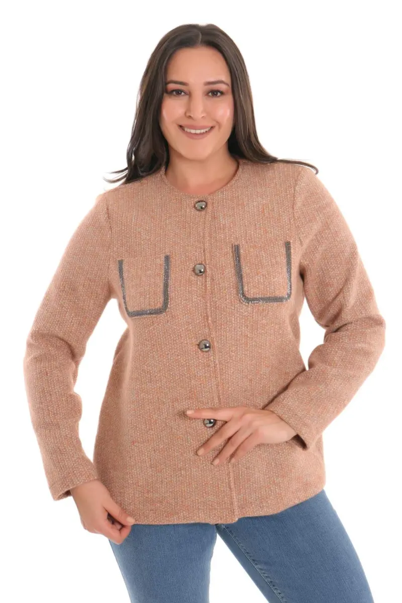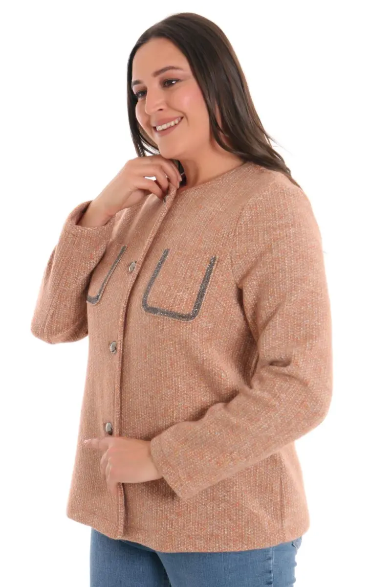 **Büyük Beden Cebi Taş Baskılı Camel Ceket**