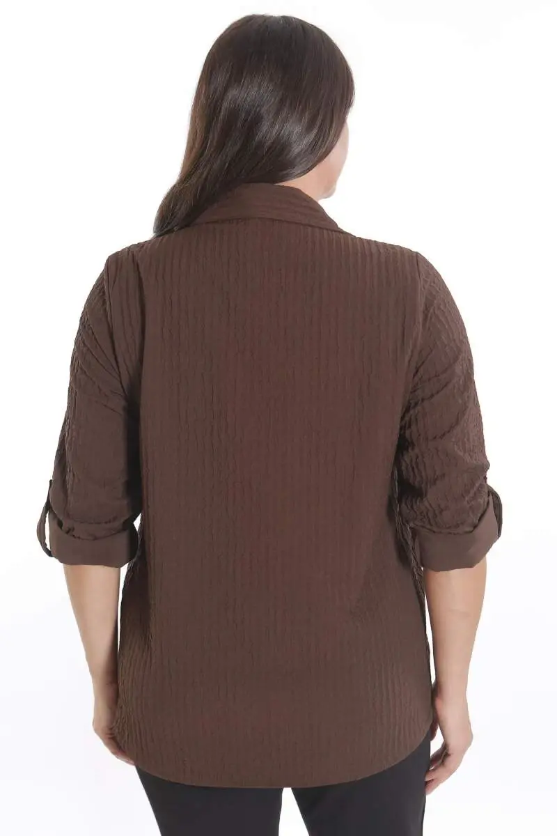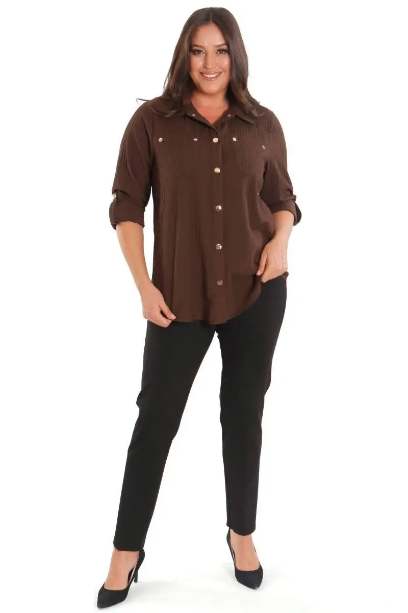 Büyük Beden Çıt Çıt Düğmeli ve Cep Detaylı Kahverengi Gömlek