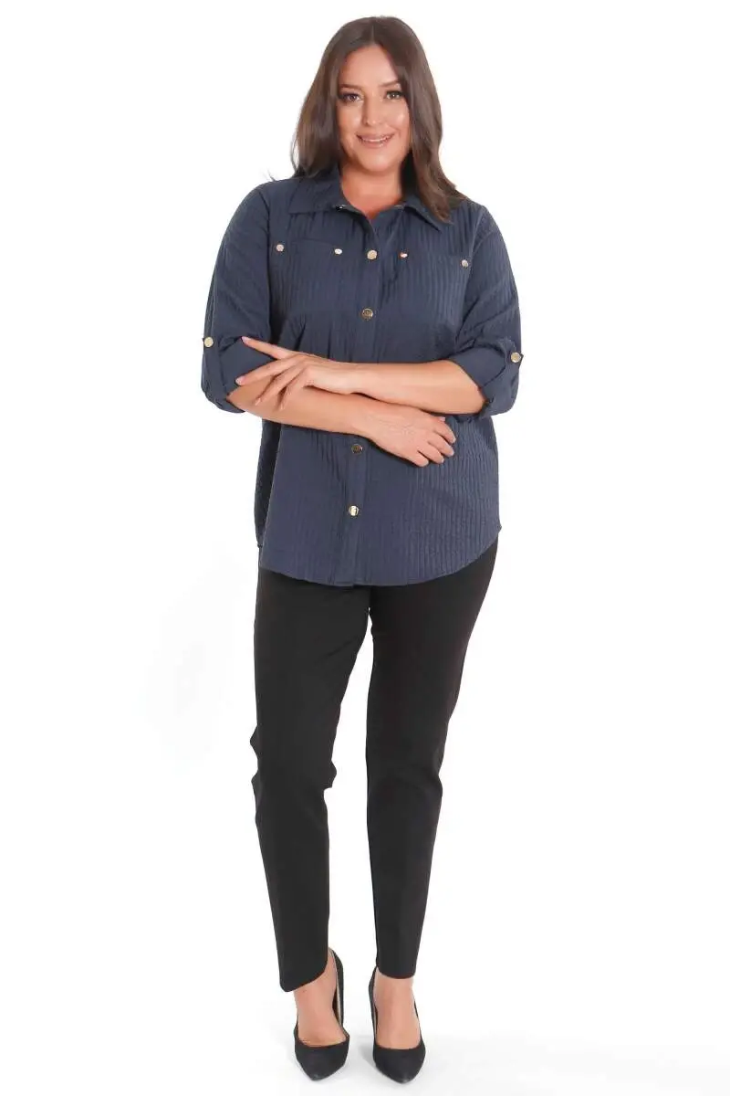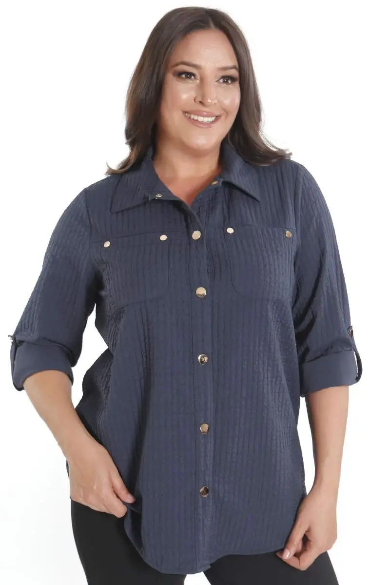 Büyük Beden Çıt Çıt Düğmeli ve Cep Detaylı Lacivert Gömlek