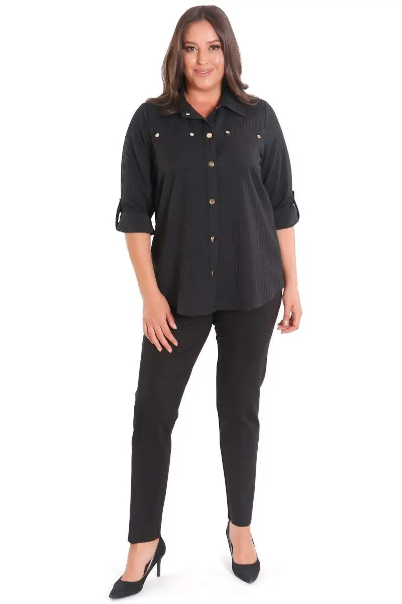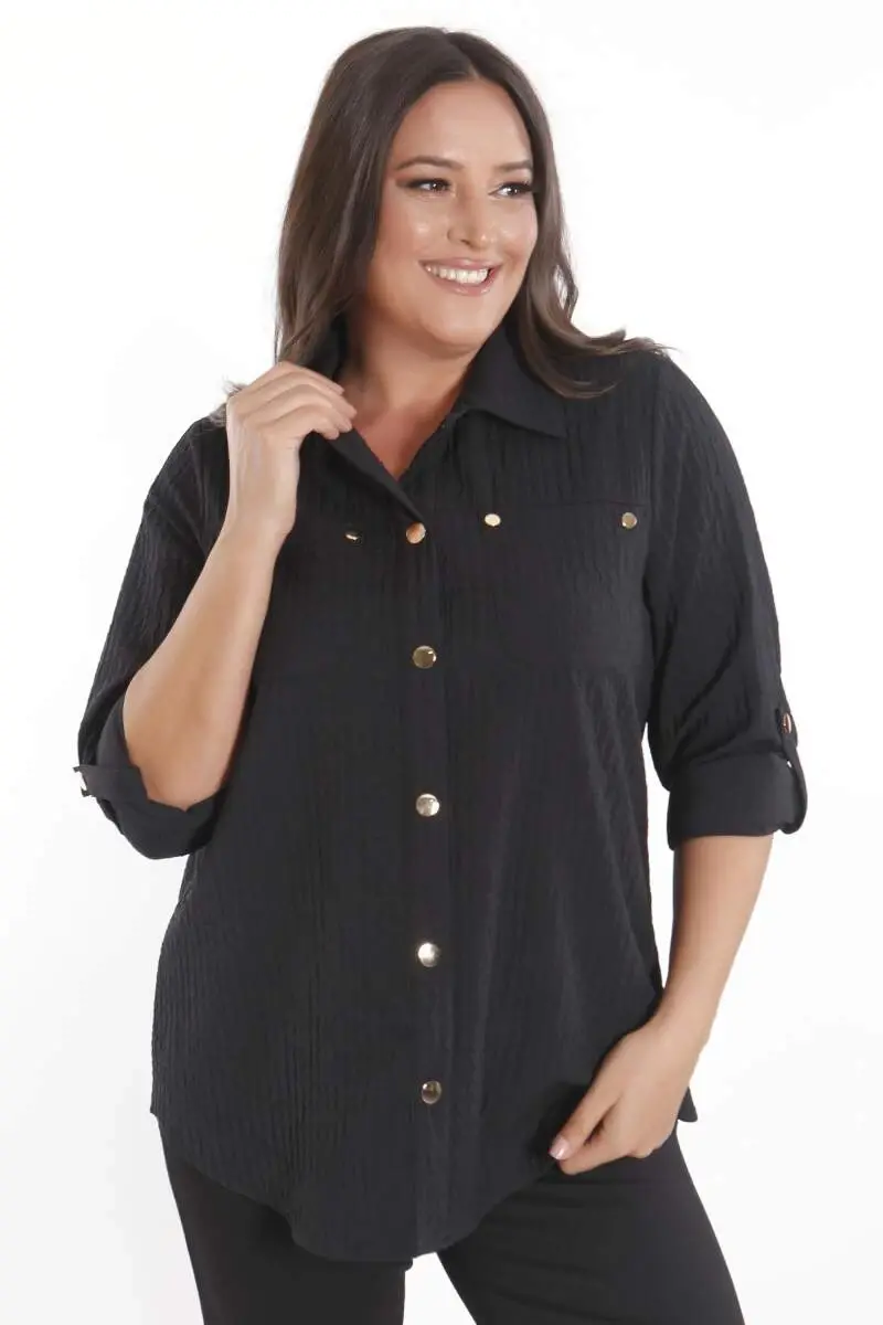 Büyük Beden Çıt Çıt Düğmeli ve Cep Detaylı Siyah Gömlek
