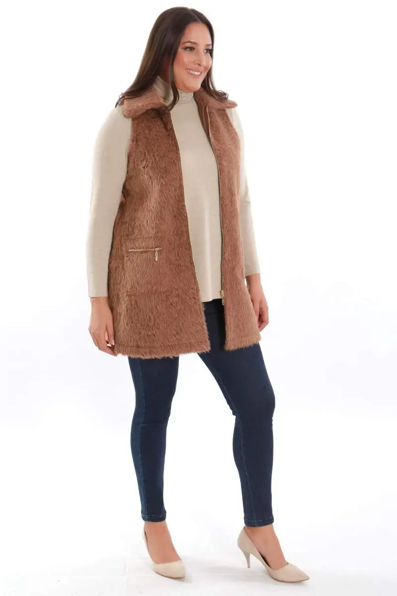 Büyük Beden Fermuar ve Cep Detaylı Kahverengi Kürk Yelek