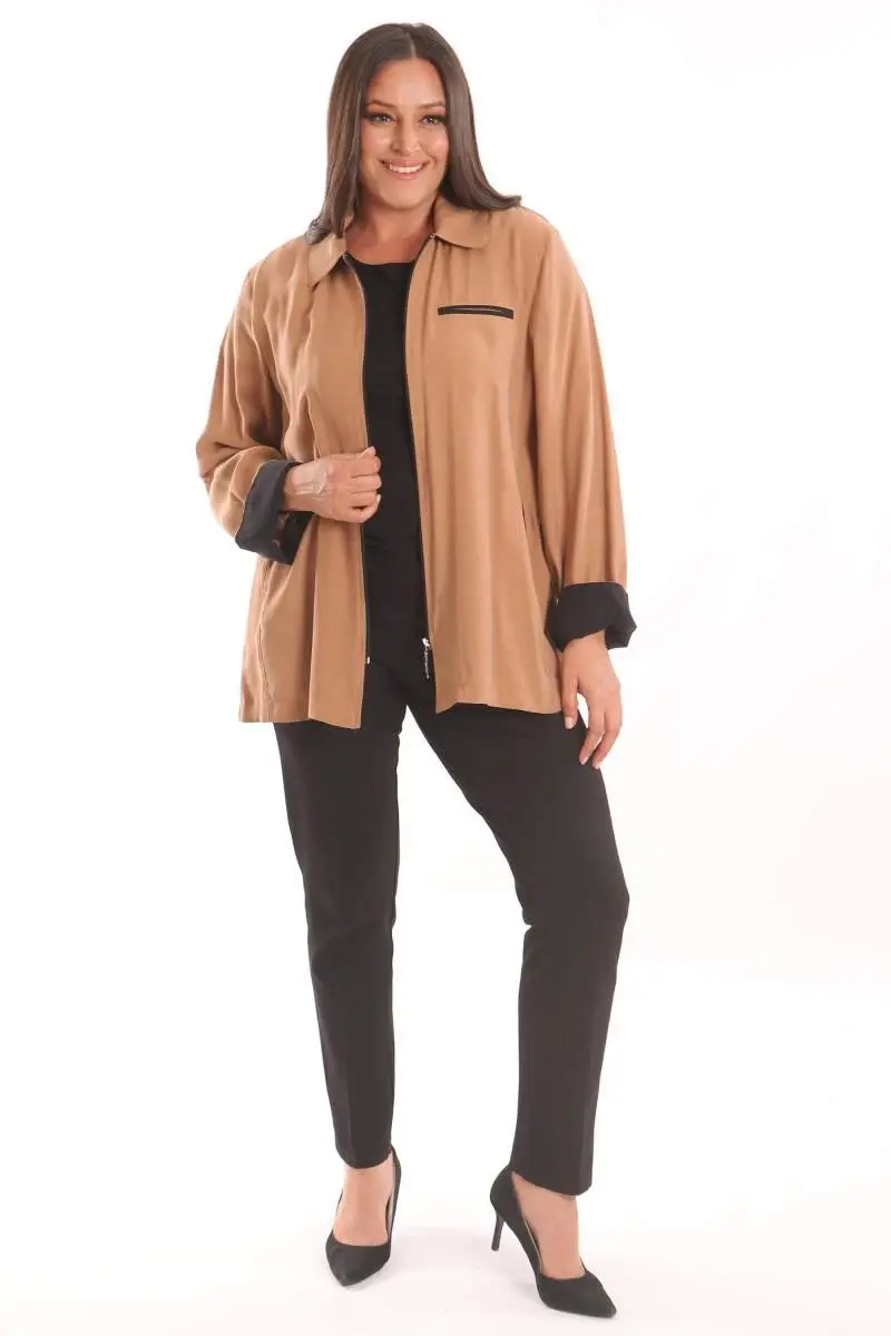Büyük Beden Fermuarlı Büyük Beden Camel Trençkot