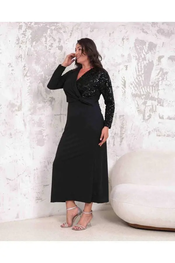 Büyük Beden Kadın Kruvaze Yaka Pul Payet Kısa Abiye Elbise GLS4050