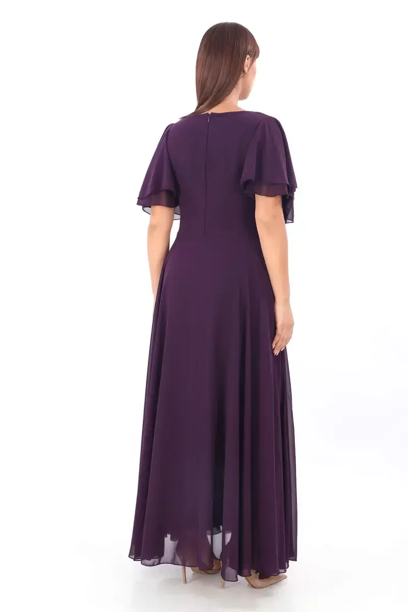 Büyük Beden Şifon Abiye Elbise | Mor | İşlemeli Pelerin Kollu | KL3045
