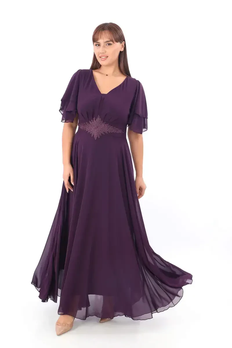 büyük beden abiye elbise, mor abiye elbise, işlemeli abiye elbise, şifon abiye elbise, özel gün kıyafeti