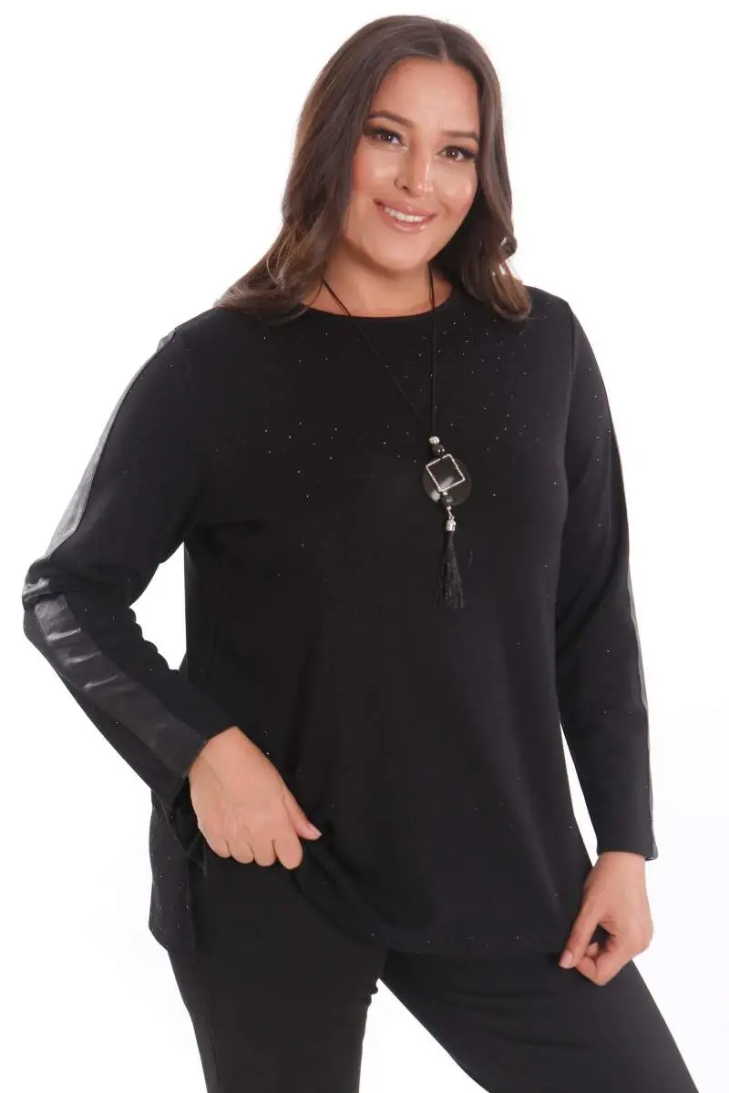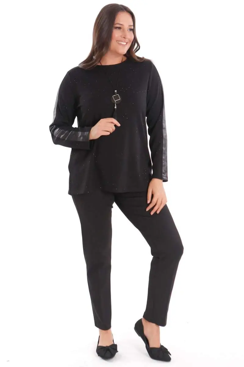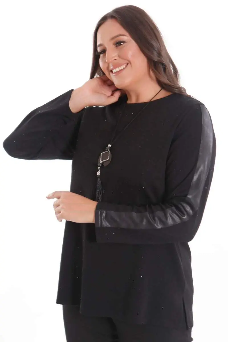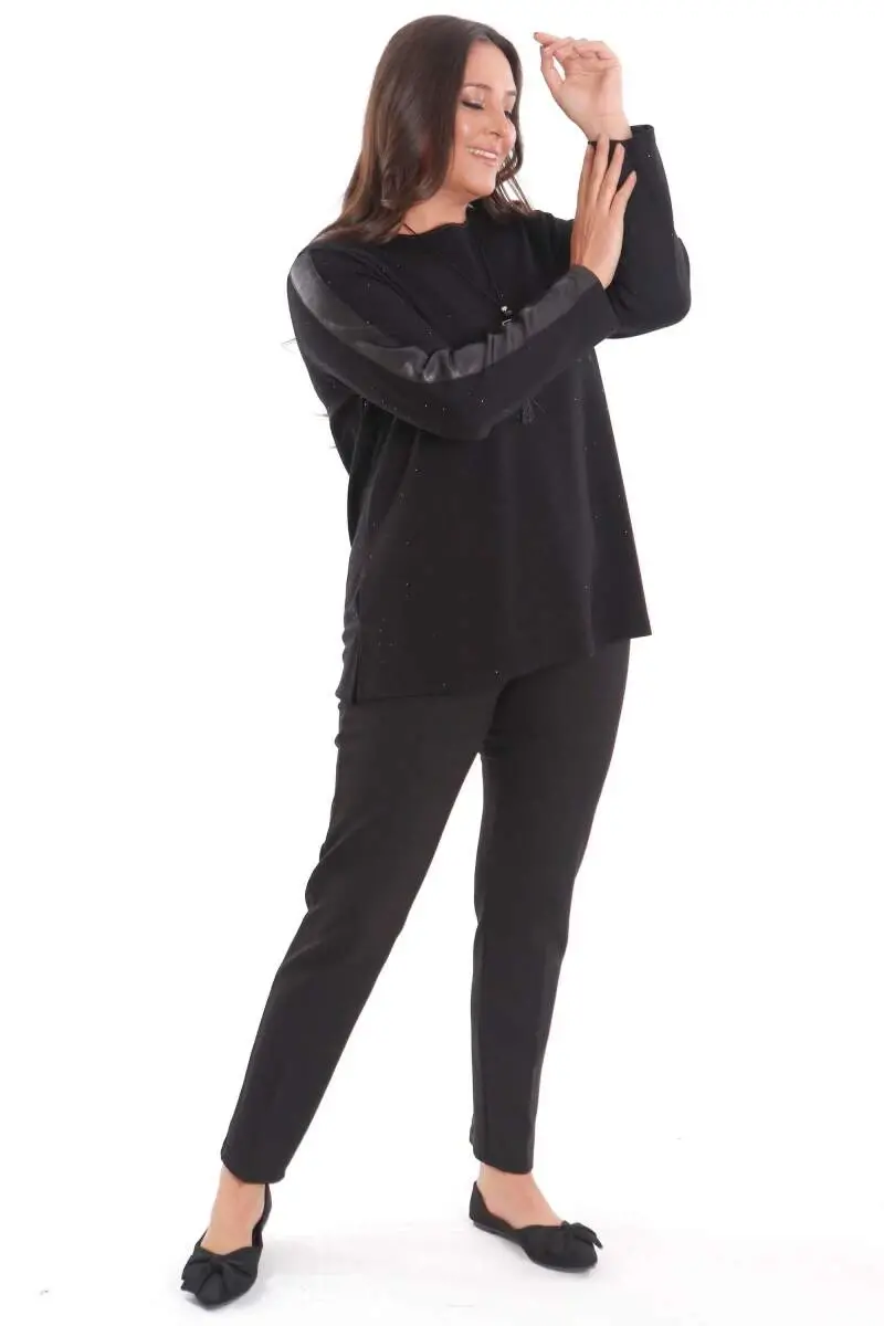Büyük Beden Kolu Deri Şerit Detaylı Kendinden Taşlı Siyah Bluz