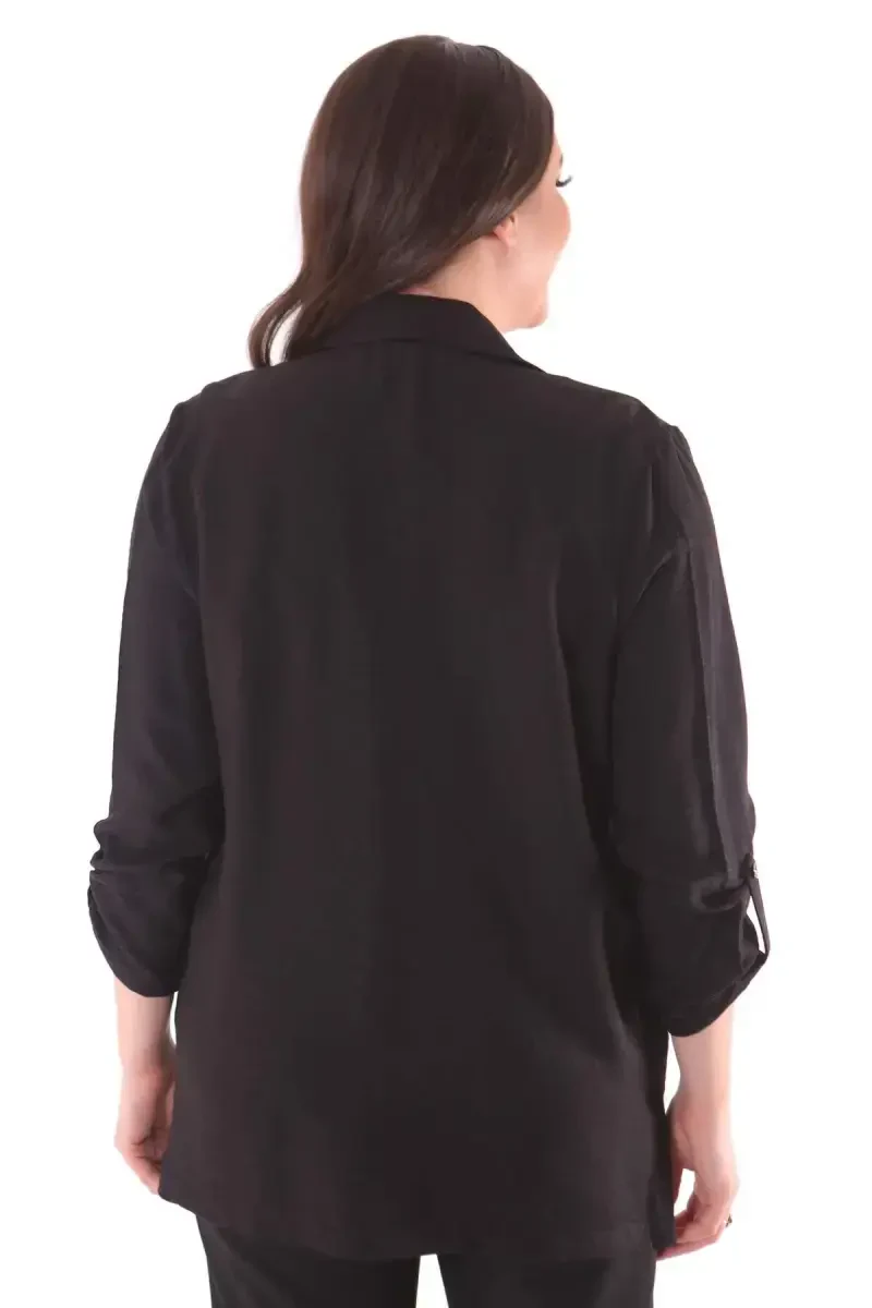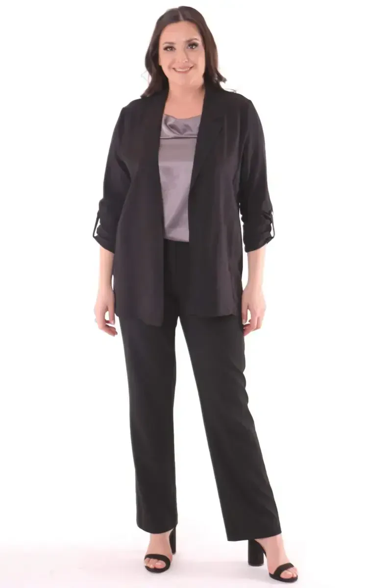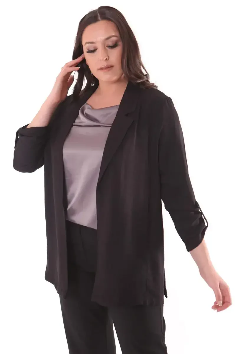 Büyük beden ceket, kruvaze yaka, siyah ceket, keten ceket, rahat ceket, şık ceket, kadın ceket, polyester ceket, kol apoletli ceket, yan yırtmaçlı ceket
