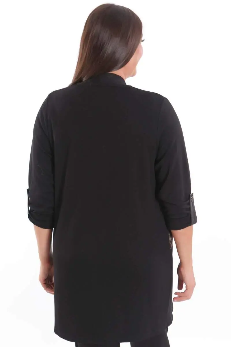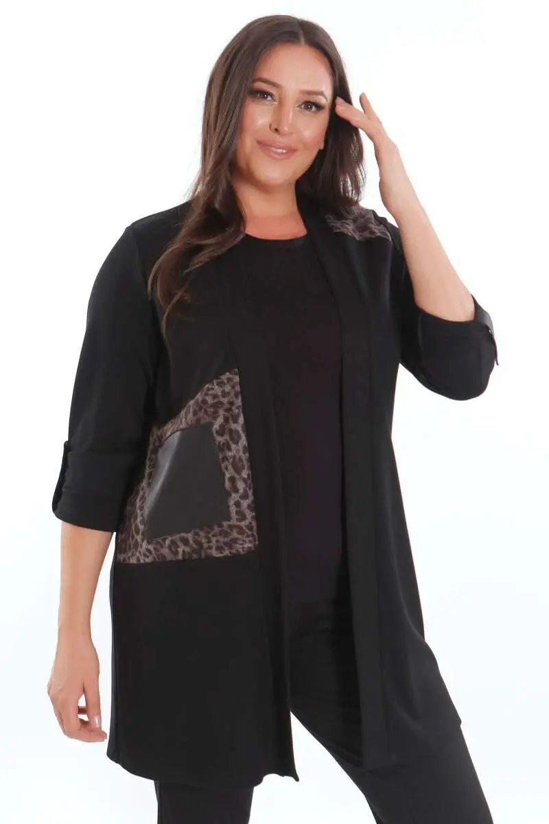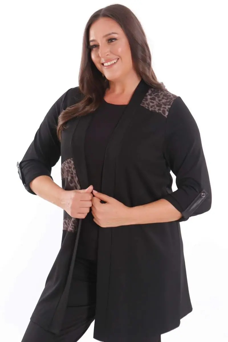 Büyük Beden Leopar Desenli Siyah Hırka Ürün Özellikleri: Salaş ve rahat bir görünüm Omuz ve bel kısmı leopar ve deri detaylı Diz üstü boy Ürün Açıklaması: Büyük Beden Leopar Desenli Siyah Hırka, tasarımda kullandığı yumuşak doku ile uzun süreli kullanımda konfor sunuyor. Kıyafetlerinizi ve şıklığınızı olumsuz hava şartlarında korurken aynı zamanda tamamlayan özel parçalardan birisi olan hırka modeli sahip olduğu rahat kalıbı ile şık bir görünüm sunuyor. Renk: Siyah Malzeme: %65 Viskoz - %30 Polister - %5 Elastan Manken Ölçüleri: Omuz: 47 cm. - Göğüs: 97 cm. - Basen: 105cm - Bel: 80 cm. - Boy: 1,80 cm. Ürün boyu 72 cm. 'dir. Model Bedeni: 44