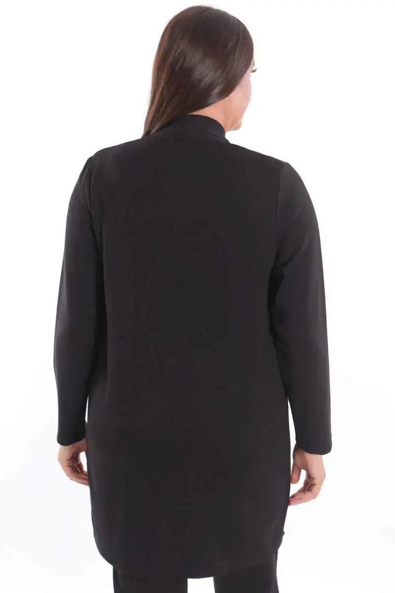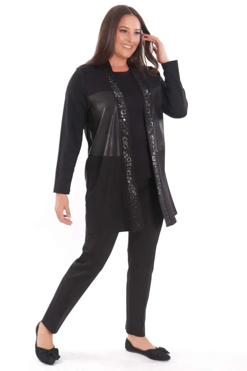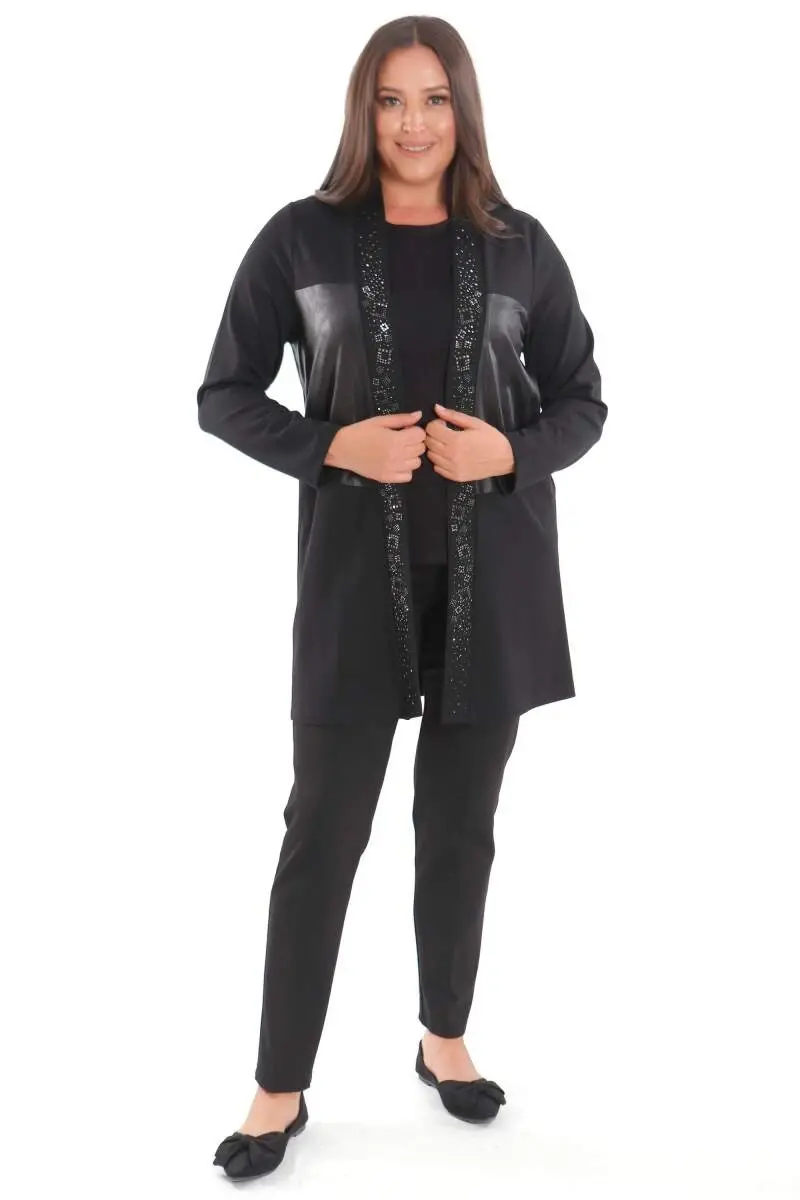 Büyük Beden Ön Deri Parçalı Taş Baskılı Siyah Hırka