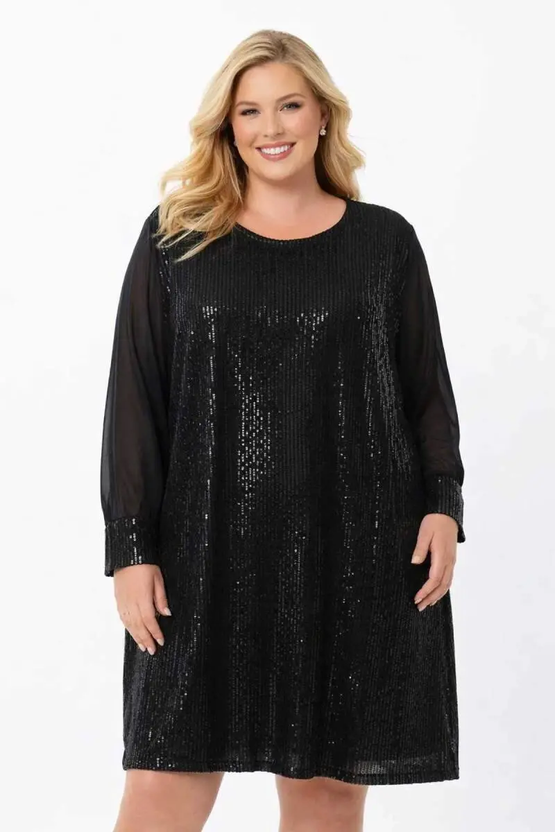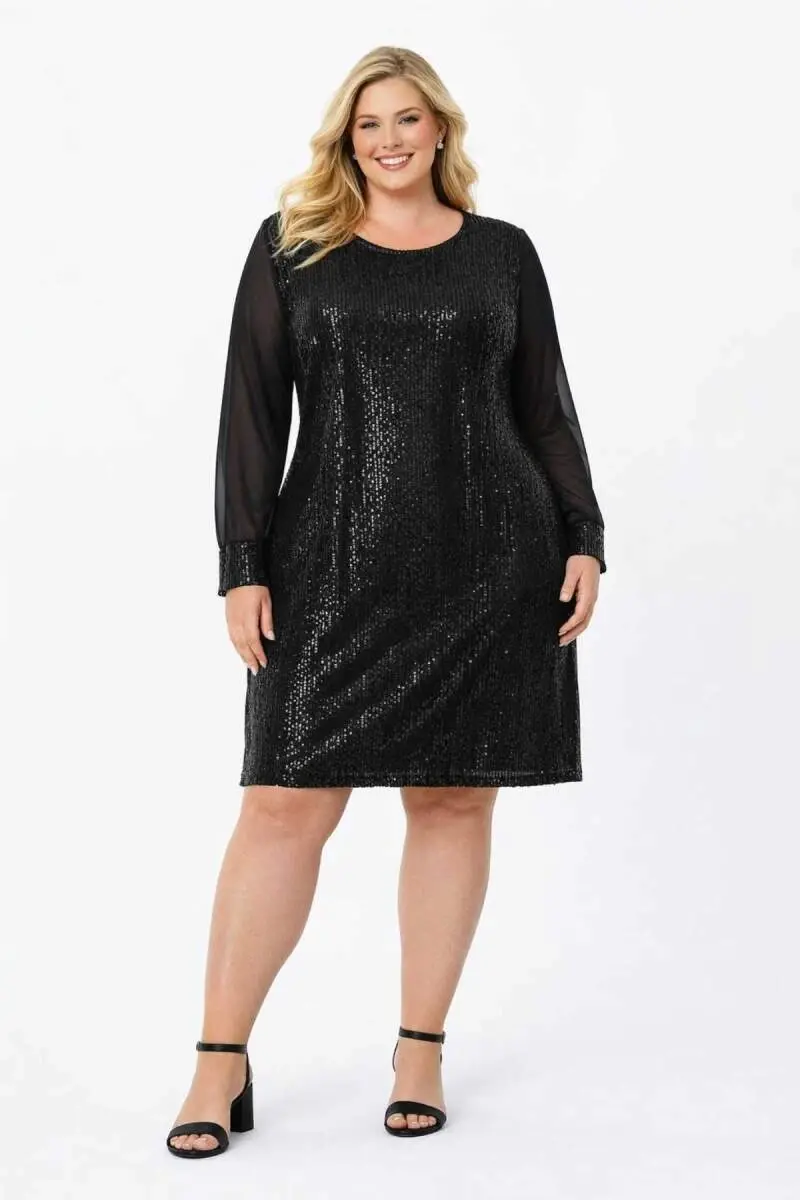 Büyük Beden Pul Payet Detaylı Bol Kesim Rahat Kalıp Kısa Abiye Elbise – Göbek Gizleyen Salaş Şık Davet Elbisesi ND4028