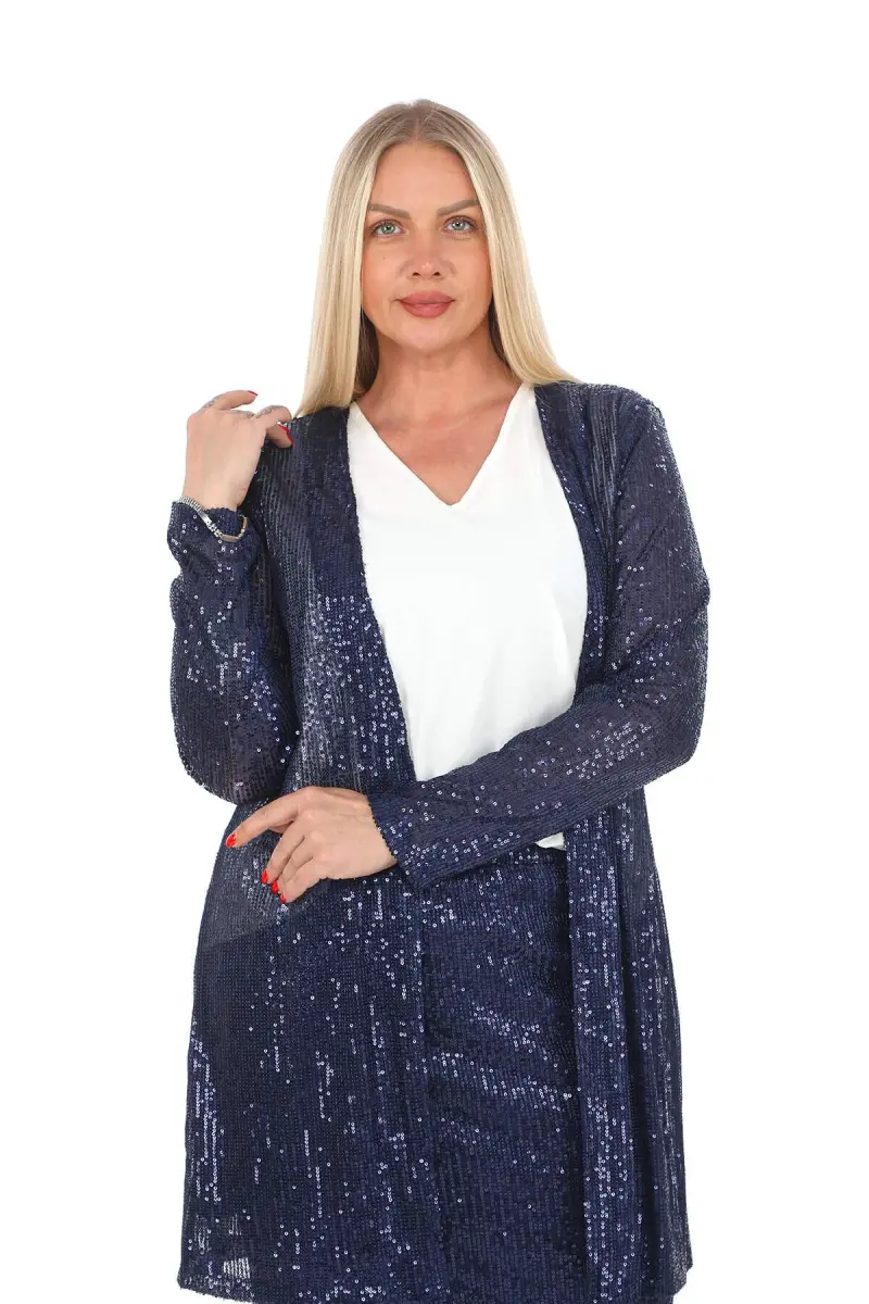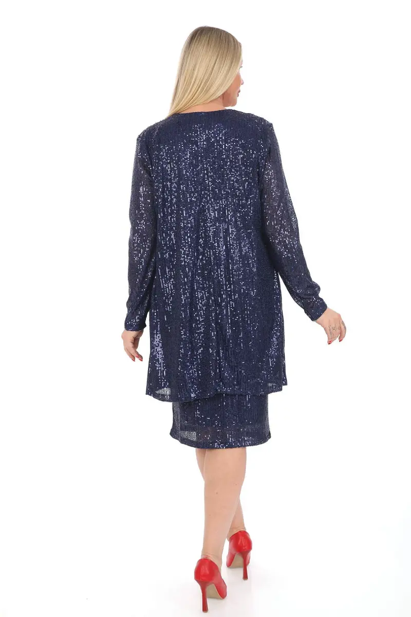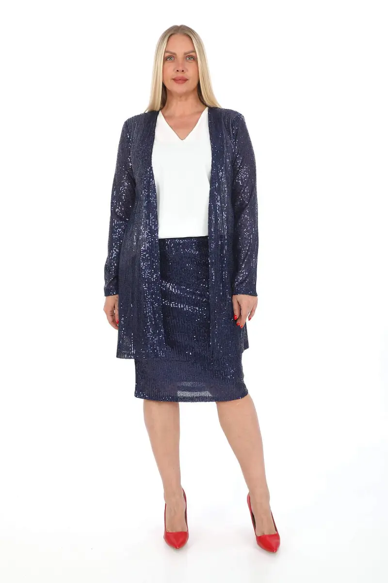 Büyük Beden Pul Payet Etek Ceket Bluz 3 Parça Takım Lacivert GLS5346