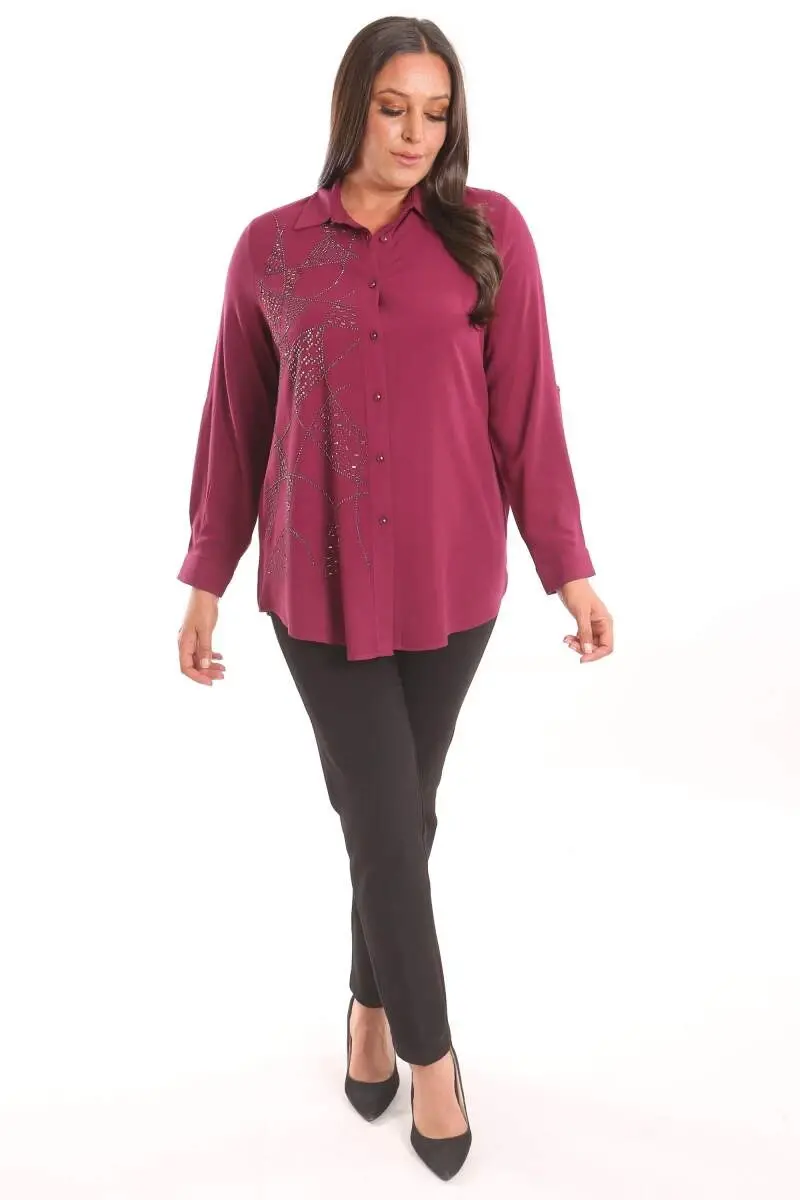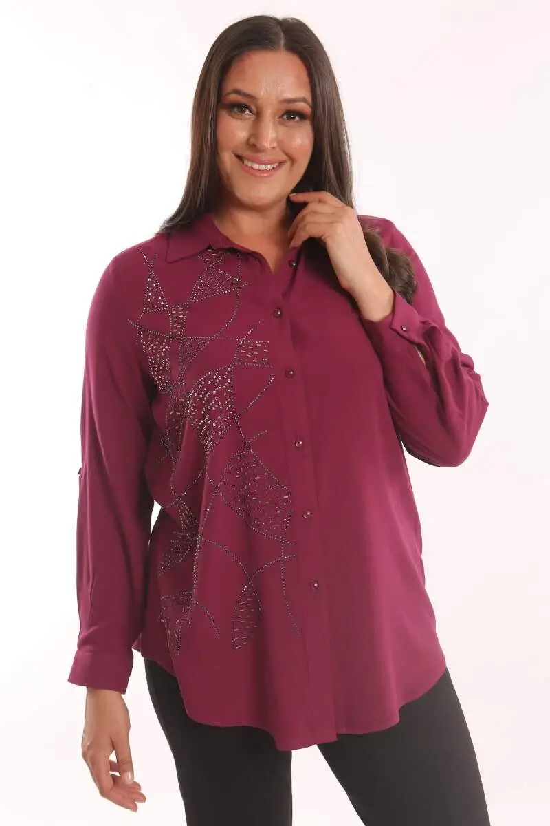 Büyük Beden Taş Baskı Detaylı Dokuma Mürdüm Gömlek