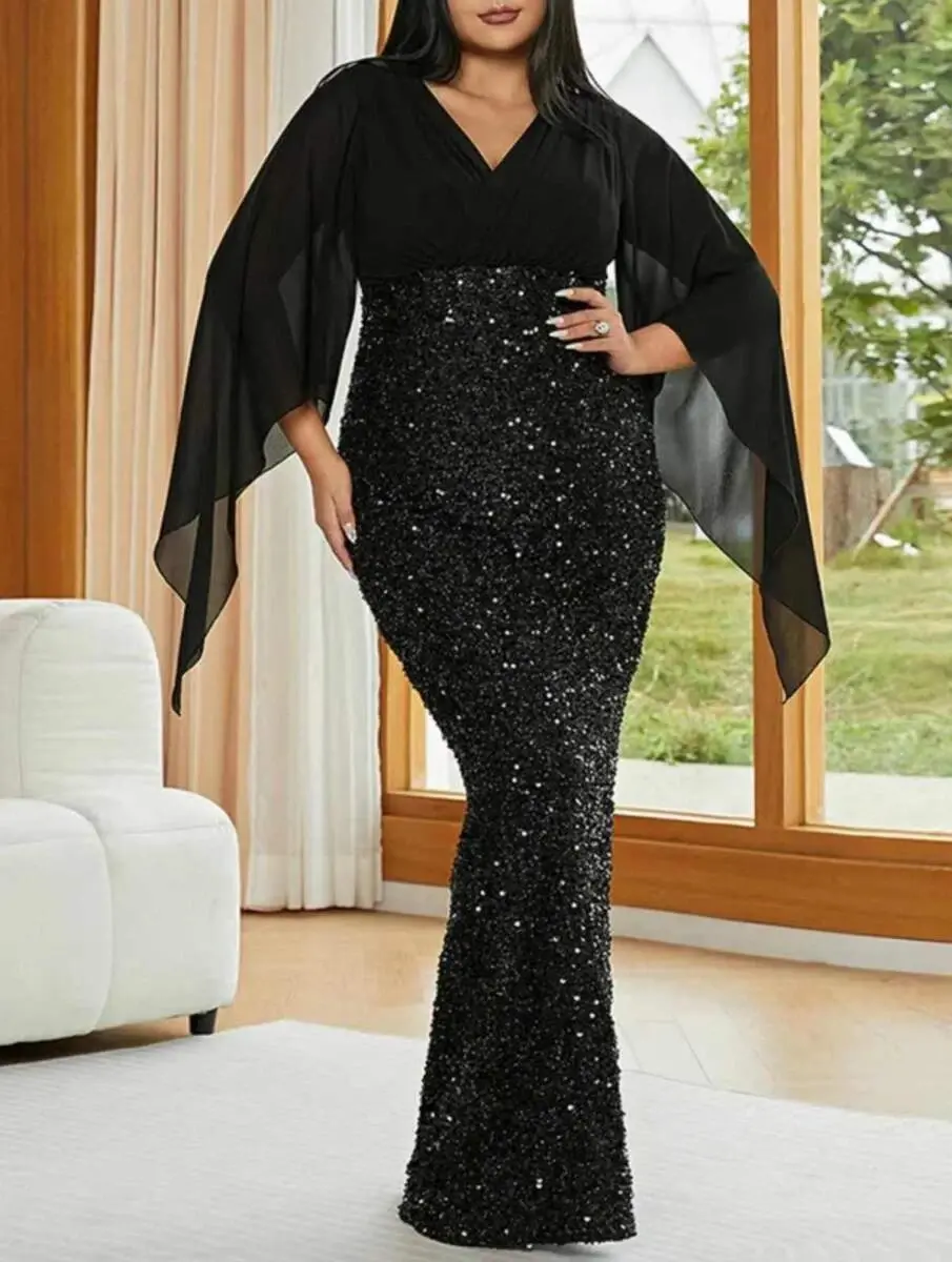 Büyük Beden V Yaka Siyah Pelerin Kollu Uzun Abiye Elbise – Işıltılı Şık Davet Elbisesi (40-62 Beden) ND4034
